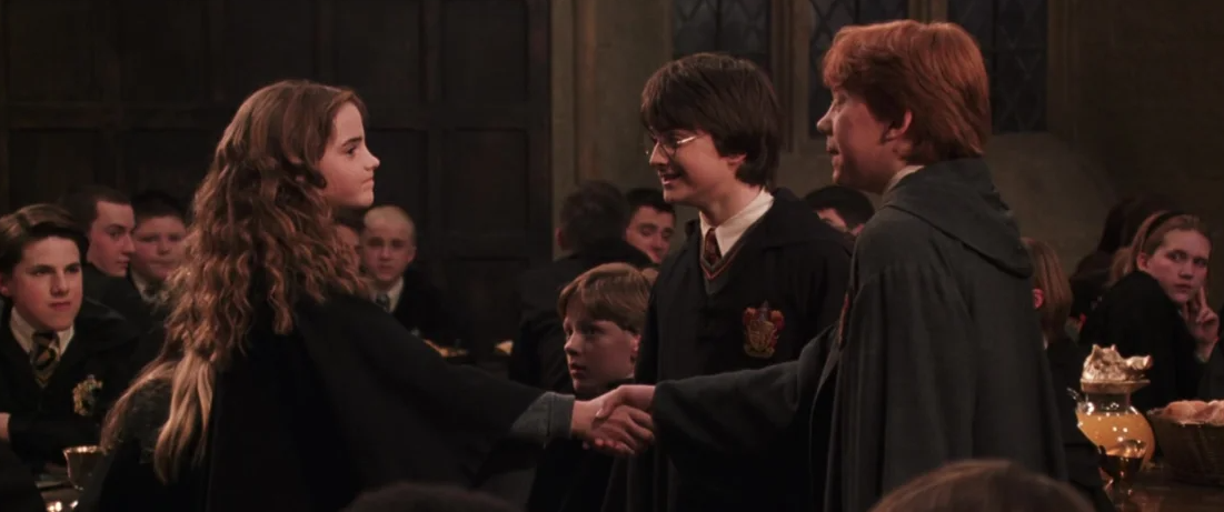Поскольку на протяжении большей части съёмок Золотое трио было детьми, их просили сделать многие вещи, которые вполне нормальны для взрослых, но у детей вызывают смущение. Одна из таких сцен случилась в конце «Тайной комнаты», где Гермиона должна была пробежать через Большой зал и обнять Гарри и Рон.