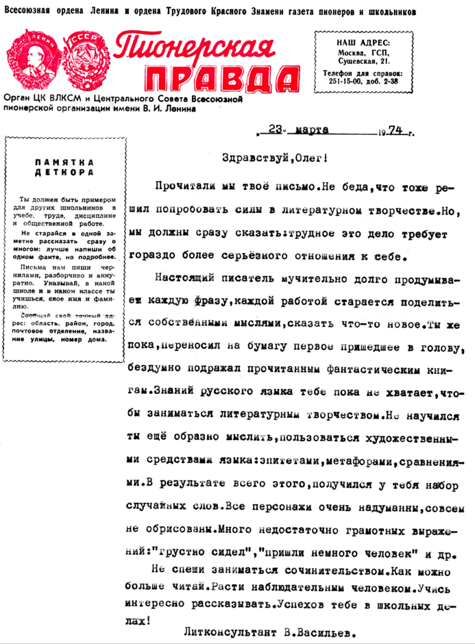 Я послал «роман» в «Пионерскую Правду». Сейчас интересно было бы почитать, но увы, «рукописи не рецензируются и не возвращаются». На удивление, редактору хватило мужества прочитать мой опус. Он даже напечатал рецензию и послал ее мне. Ниже текст письма, наложенный на его скан. Там все понятно без комментариев. Уже начало: «не беда, что тоже решил попробовать силы в литературном творчестве», расставляет все точки над «i».
