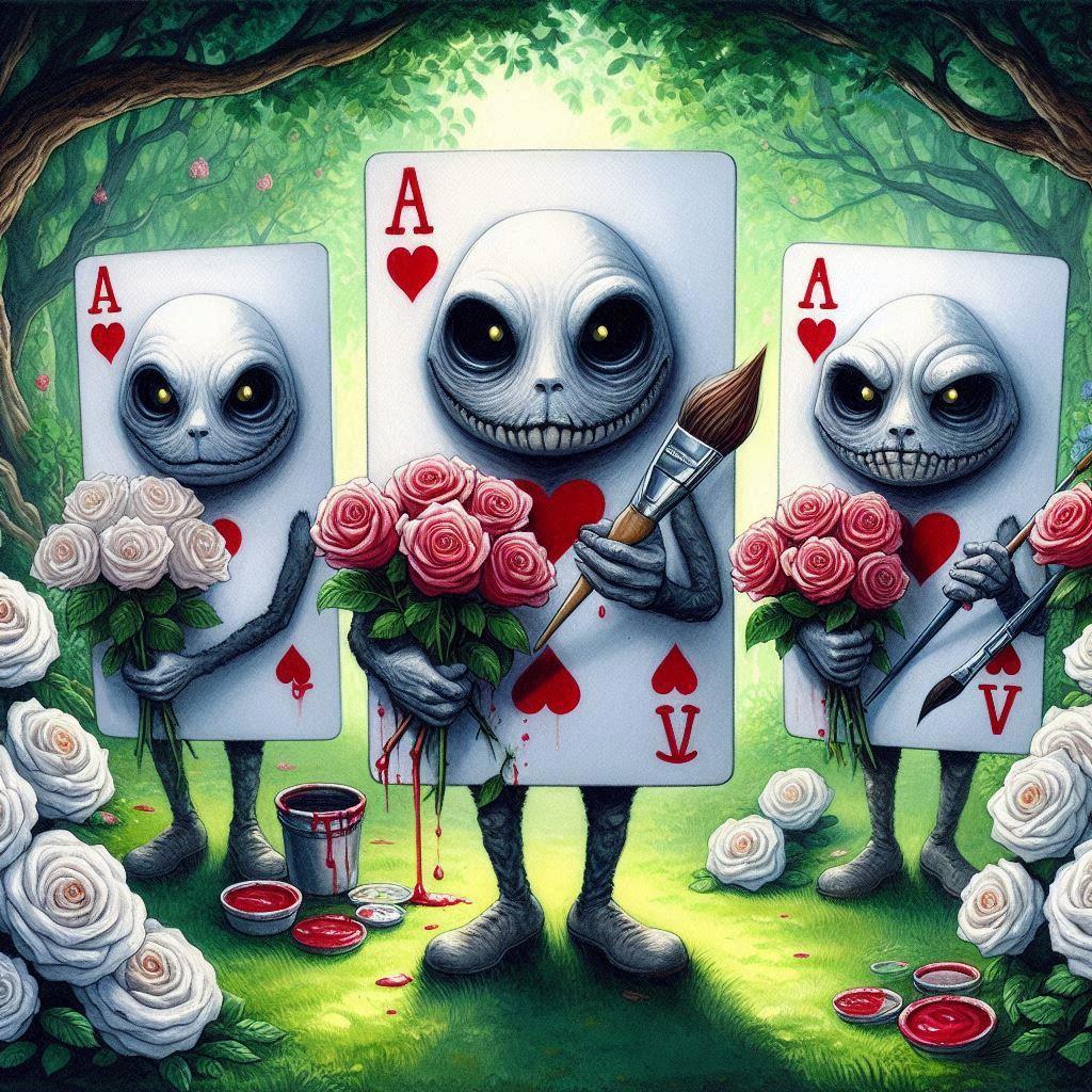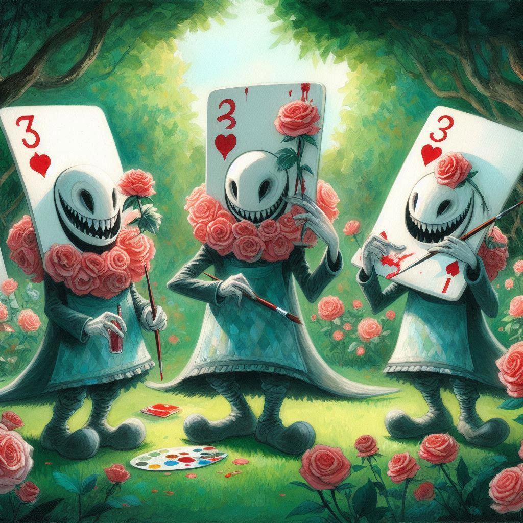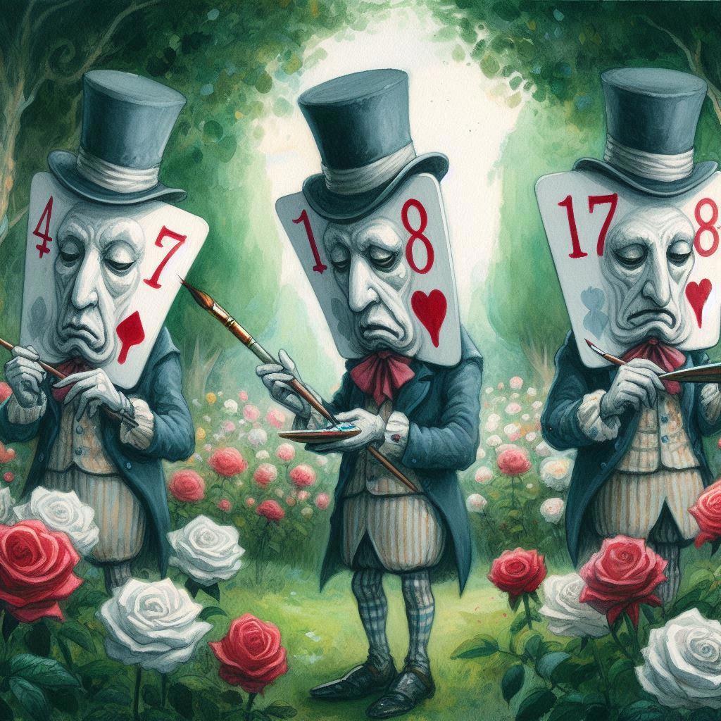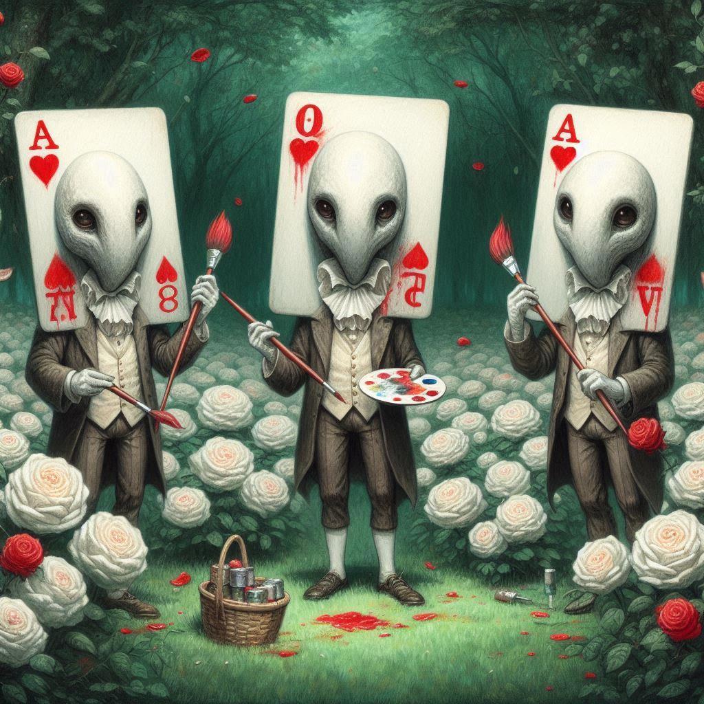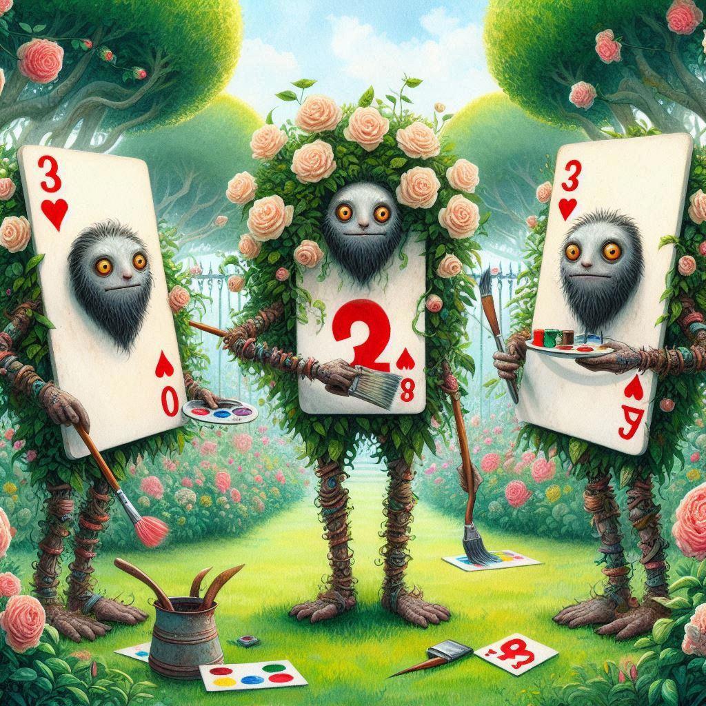 Автор: Олег ПелипейченкоУ меня большое подозрение, что нейросеть сама читает книги, по которым создаёт изображения, и в генерируемых картинках отражает свои впечатления от них. Иначе как объяснить тот факт, что мне так и не удалось даже приблизиться к традиционному облику трех карт, красящих розы в красный цвет в саду Королевы Червей в "Алисе в Стране чудес", как бы я ни изощрялся в текстовых деталях? У нейросети оказалось своё мнение по поводу этих персонажей, и она весьма недвусмысленно это показала.