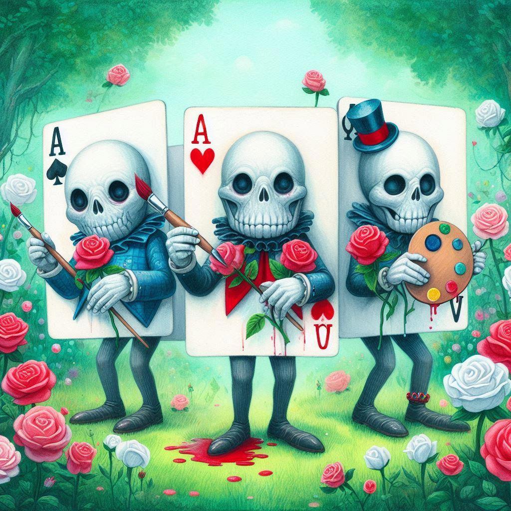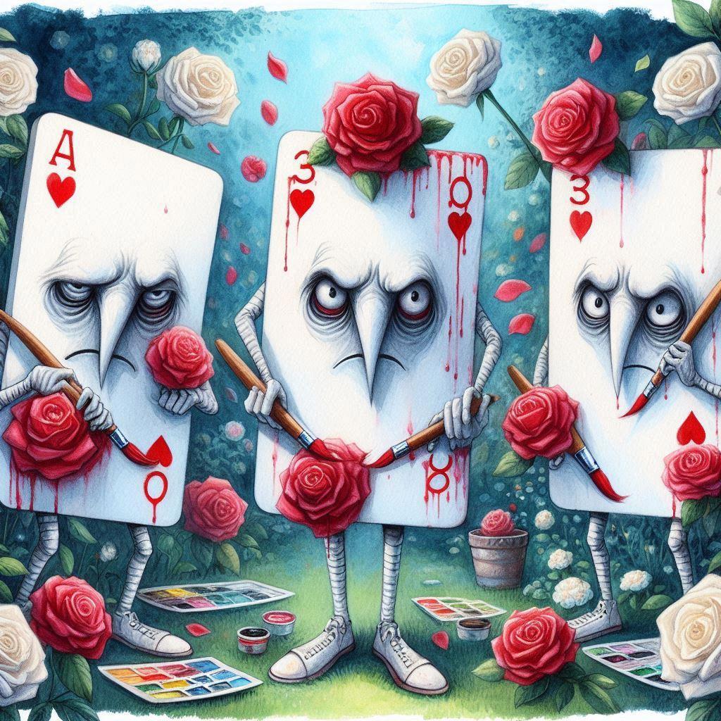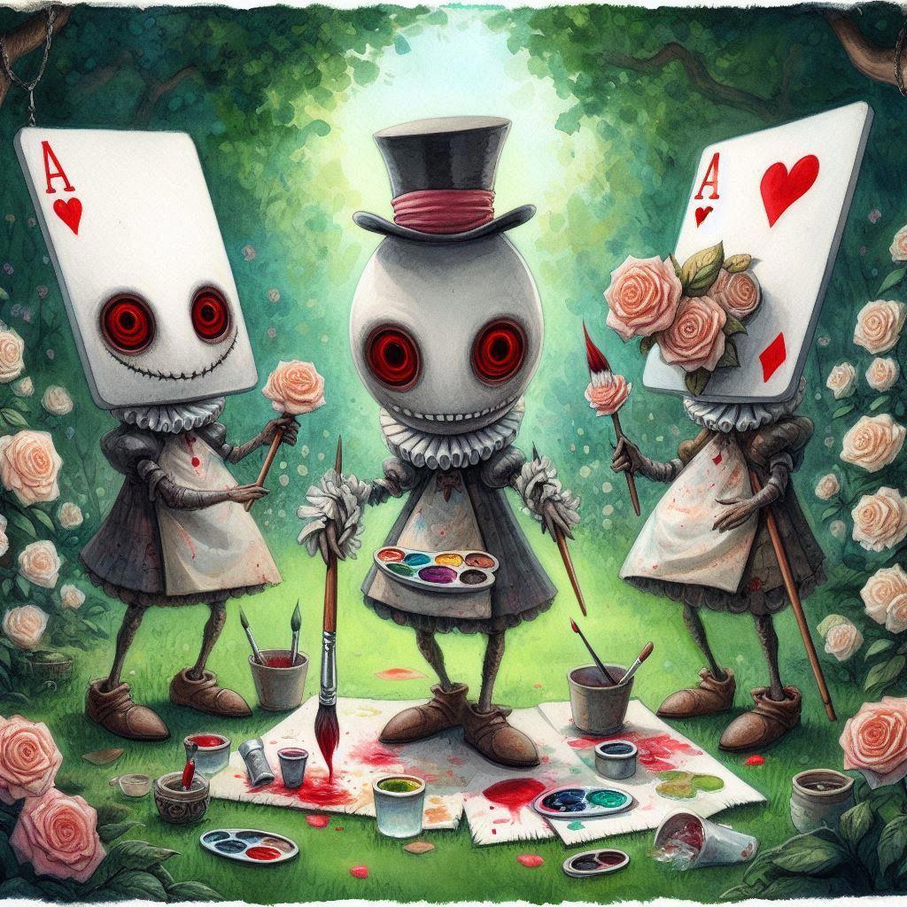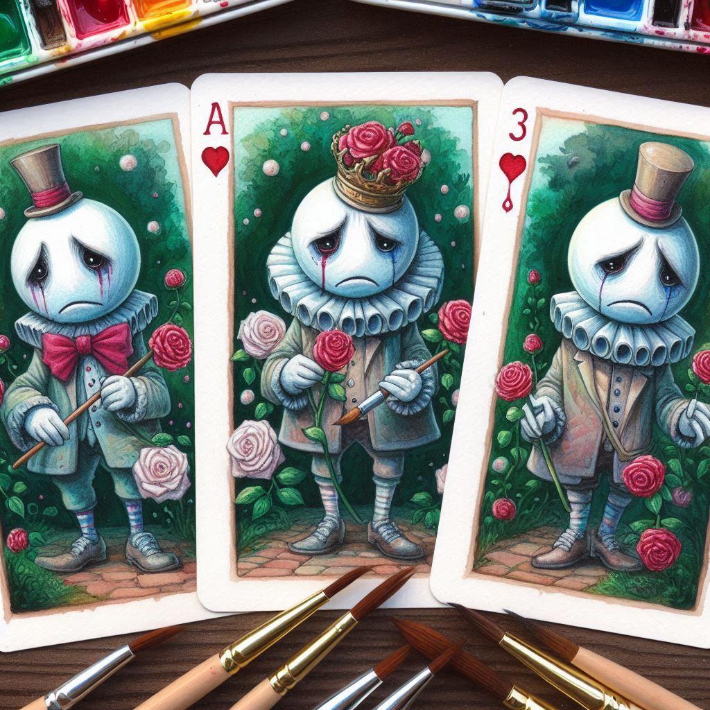 Автор: Олег ПелипейченкоУ меня большое подозрение, что нейросеть сама читает книги, по которым создаёт изображения, и в генерируемых картинках отражает свои впечатления от них. Иначе как объяснить тот факт, что мне так и не удалось даже приблизиться к традиционному облику трех карт, красящих розы в красный цвет в саду Королевы Червей в "Алисе в Стране чудес", как бы я ни изощрялся в текстовых деталях? У нейросети оказалось своё мнение по поводу этих персонажей, и она весьма недвусмысленно это показала.