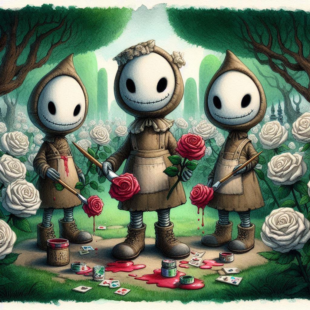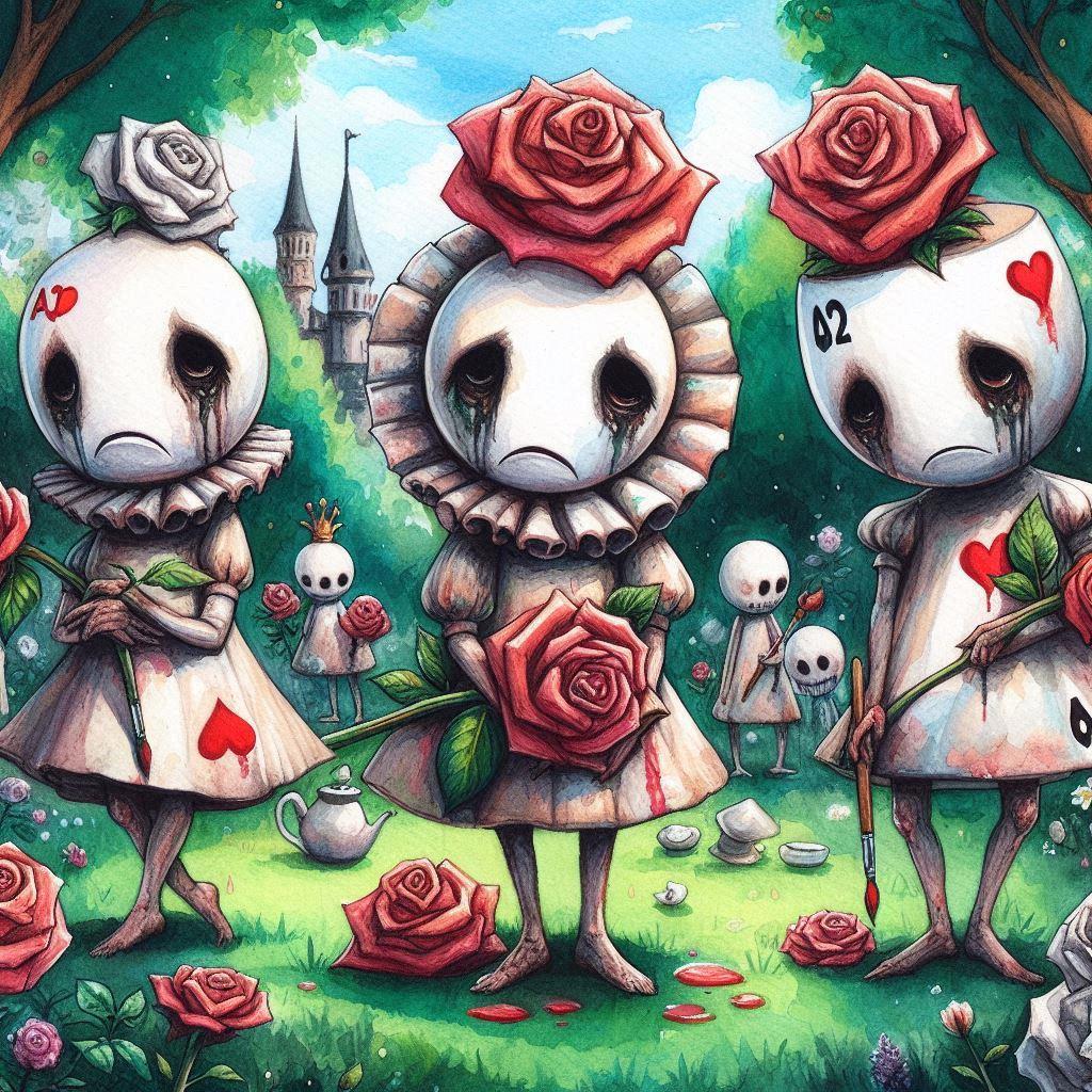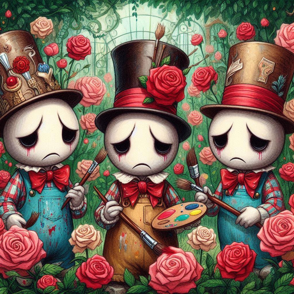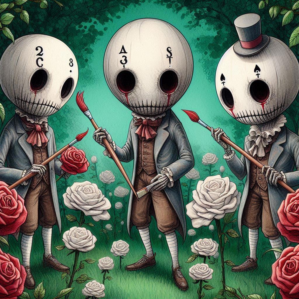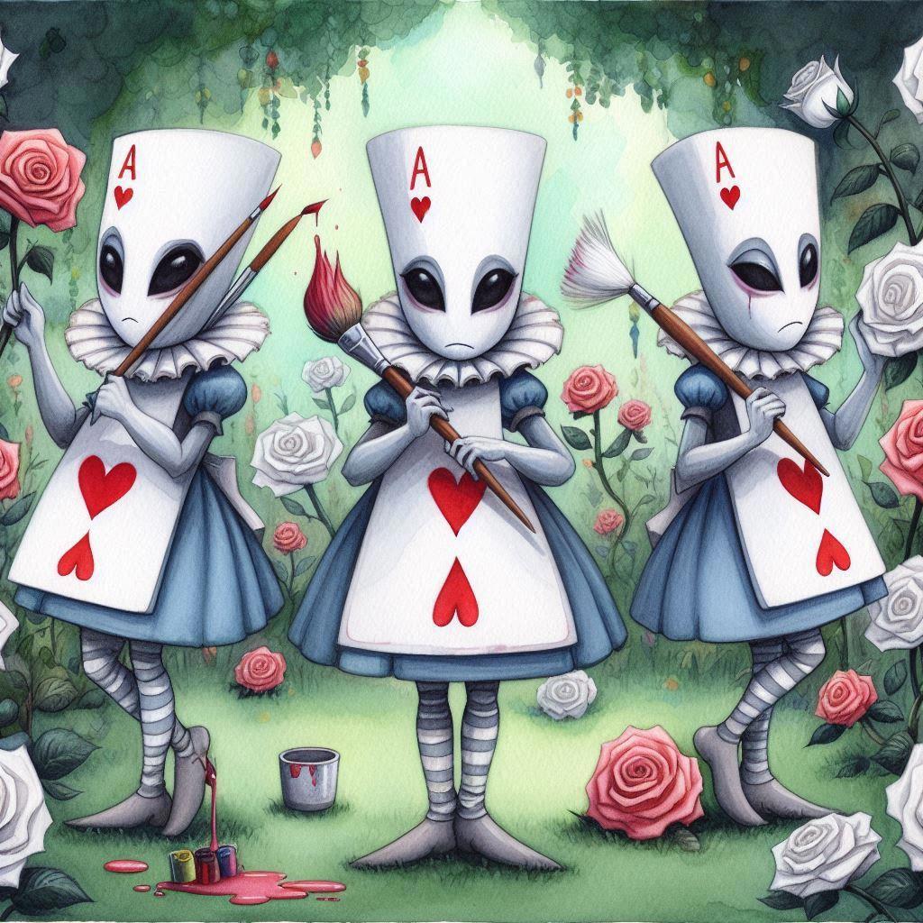 Автор: Олег ПелипейченкоУ меня большое подозрение, что нейросеть сама читает книги, по которым создаёт изображения, и в генерируемых картинках отражает свои впечатления от них. Иначе как объяснить тот факт, что мне так и не удалось даже приблизиться к традиционному облику трех карт, красящих розы в красный цвет в саду Королевы Червей в "Алисе в Стране чудес", как бы я ни изощрялся в текстовых деталях? У нейросети оказалось своё мнение по поводу этих персонажей, и она весьма недвусмысленно это показала.