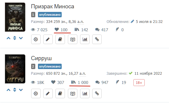 Во-первых, глядите на эти циферки — тысяча библиотек на «Сирруше» и сотня лайков на «Призраке Миноса»!
