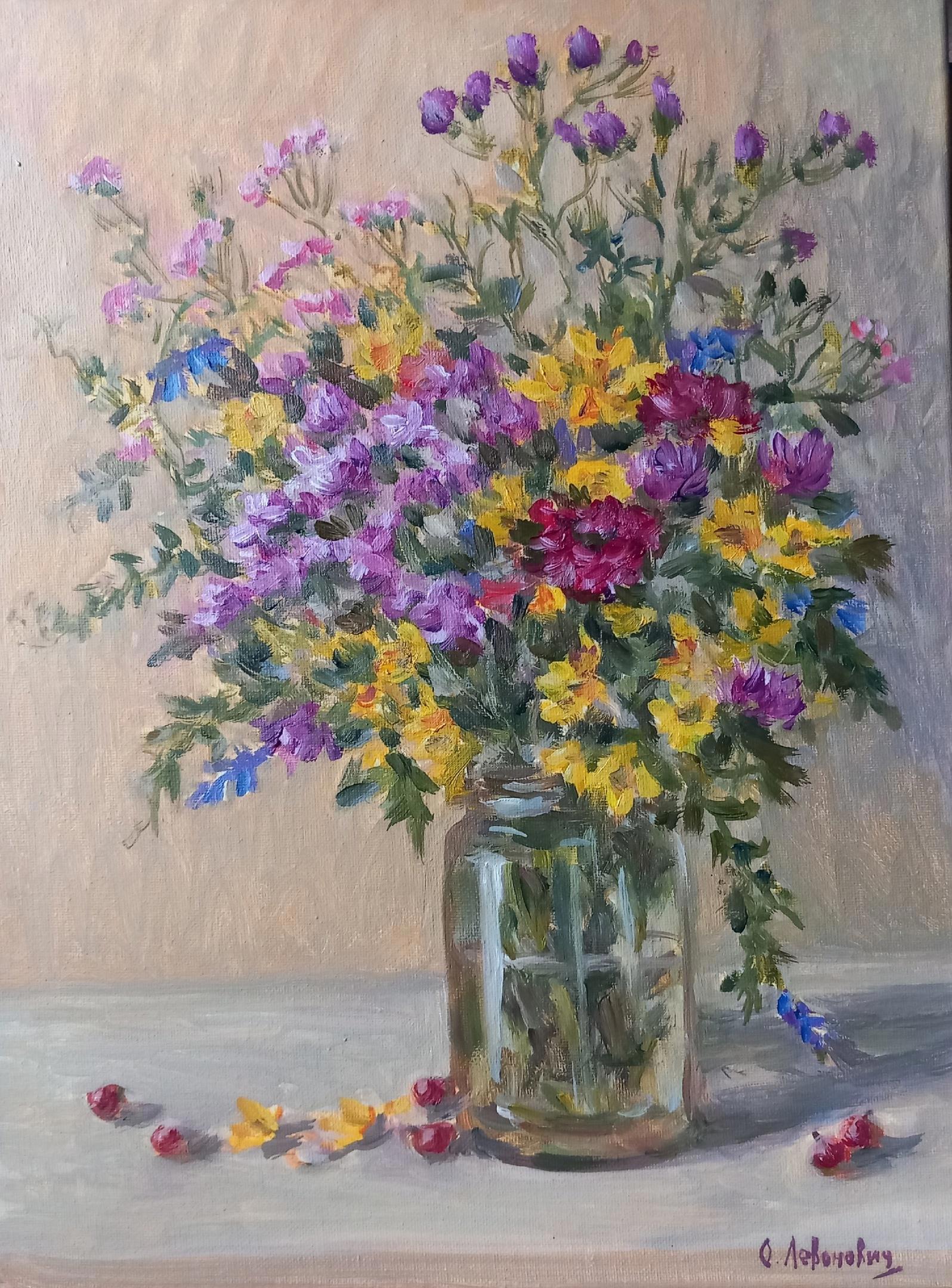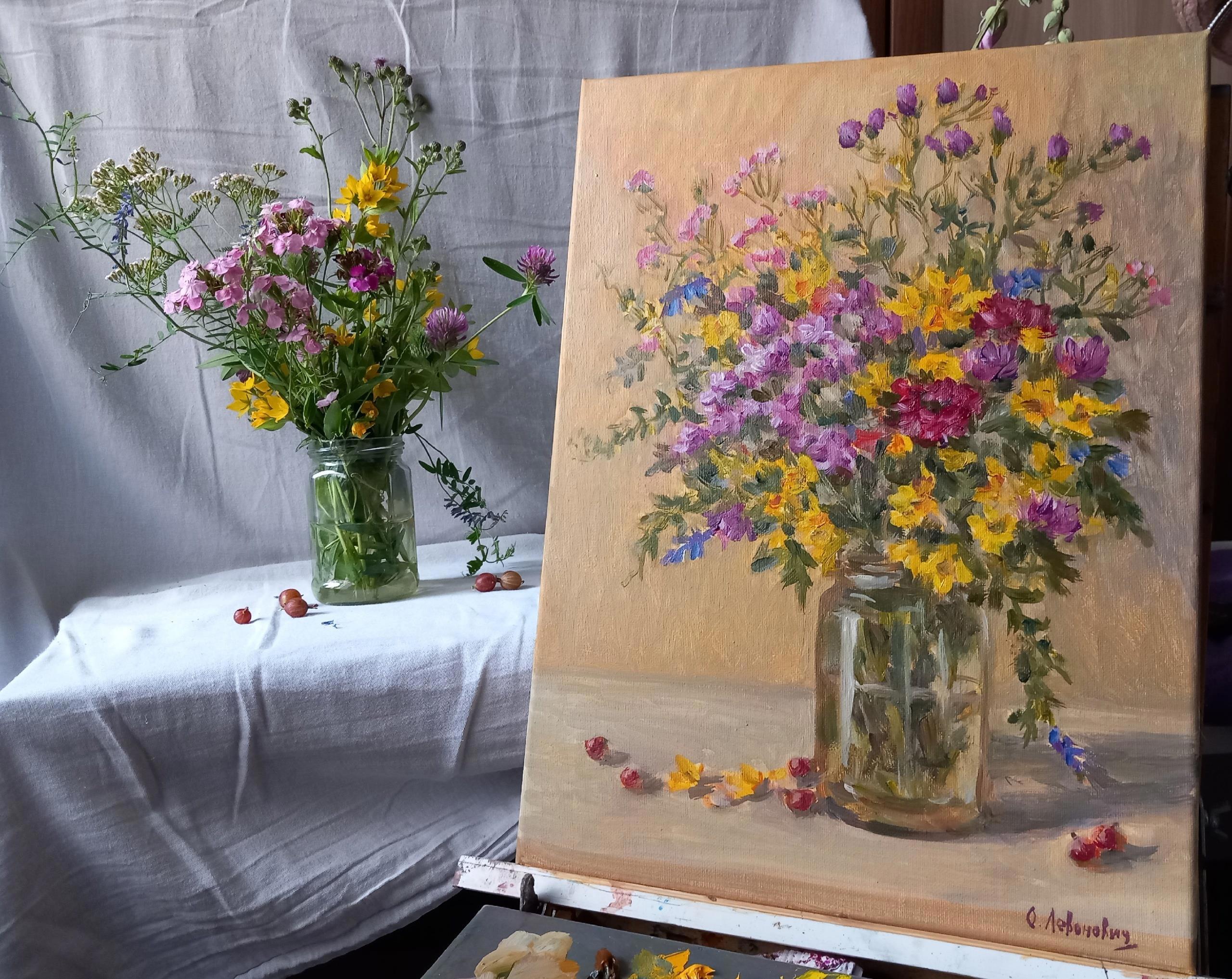 Всё, пора остановиться. Всё утро, без устали, писала букетик полевых цветов. Холст, масло, 30х40. Фон сознательно сделала тёплым, охристым. Получилось пёстро, празднично, густо.