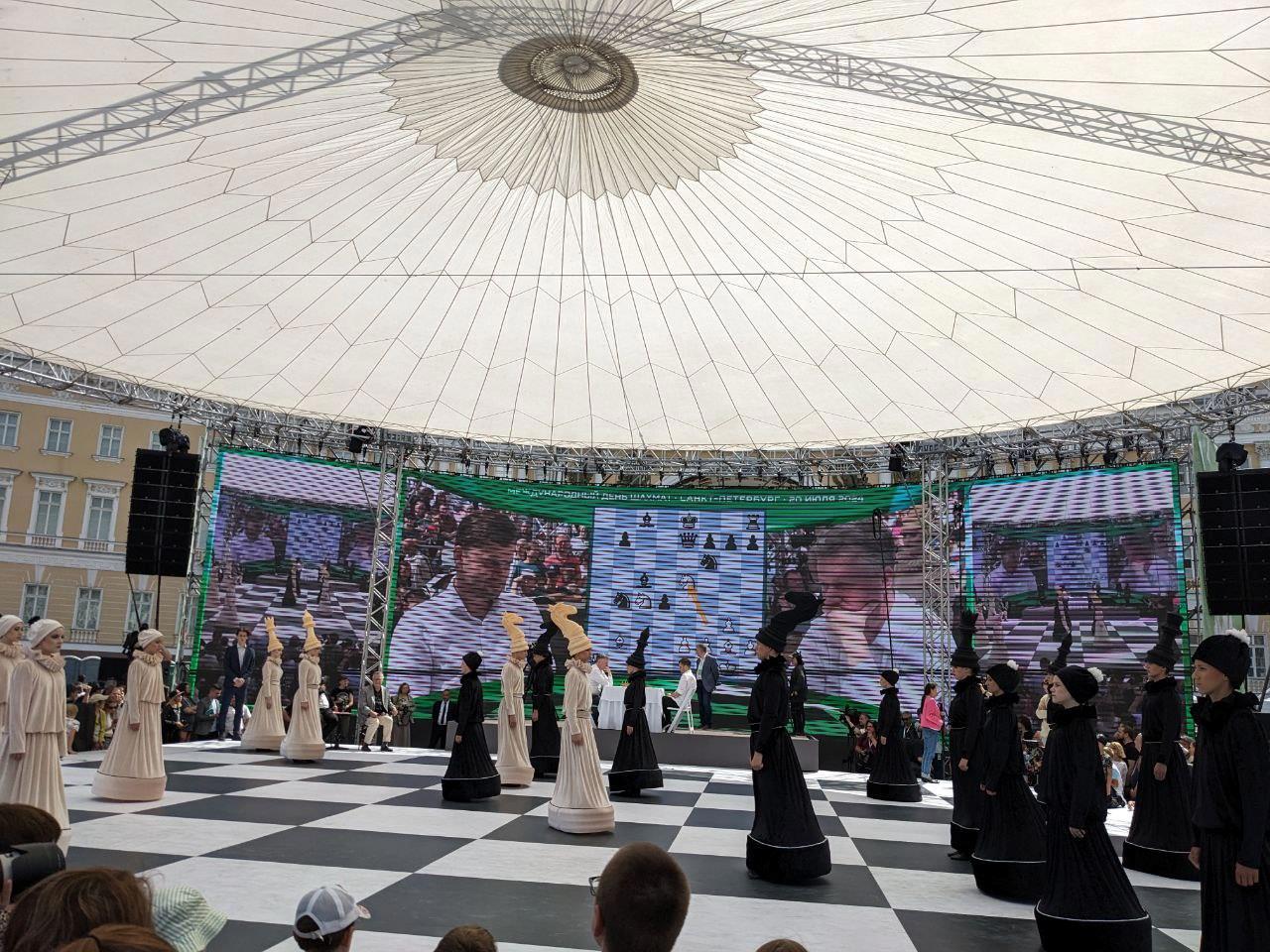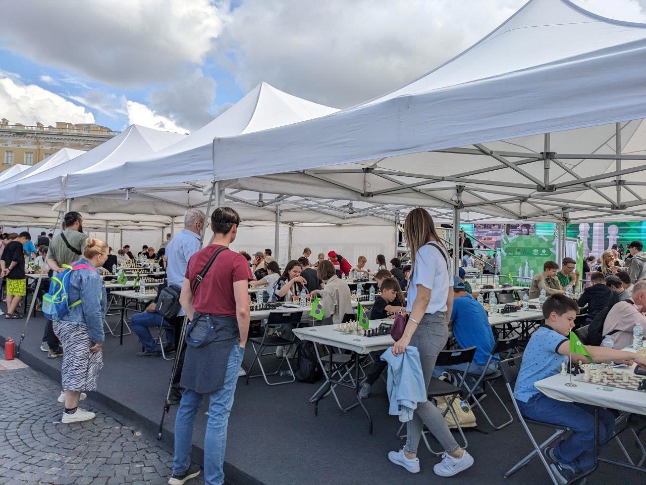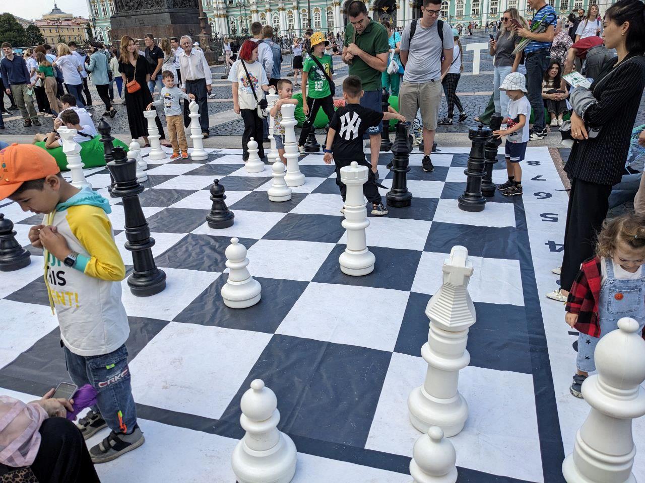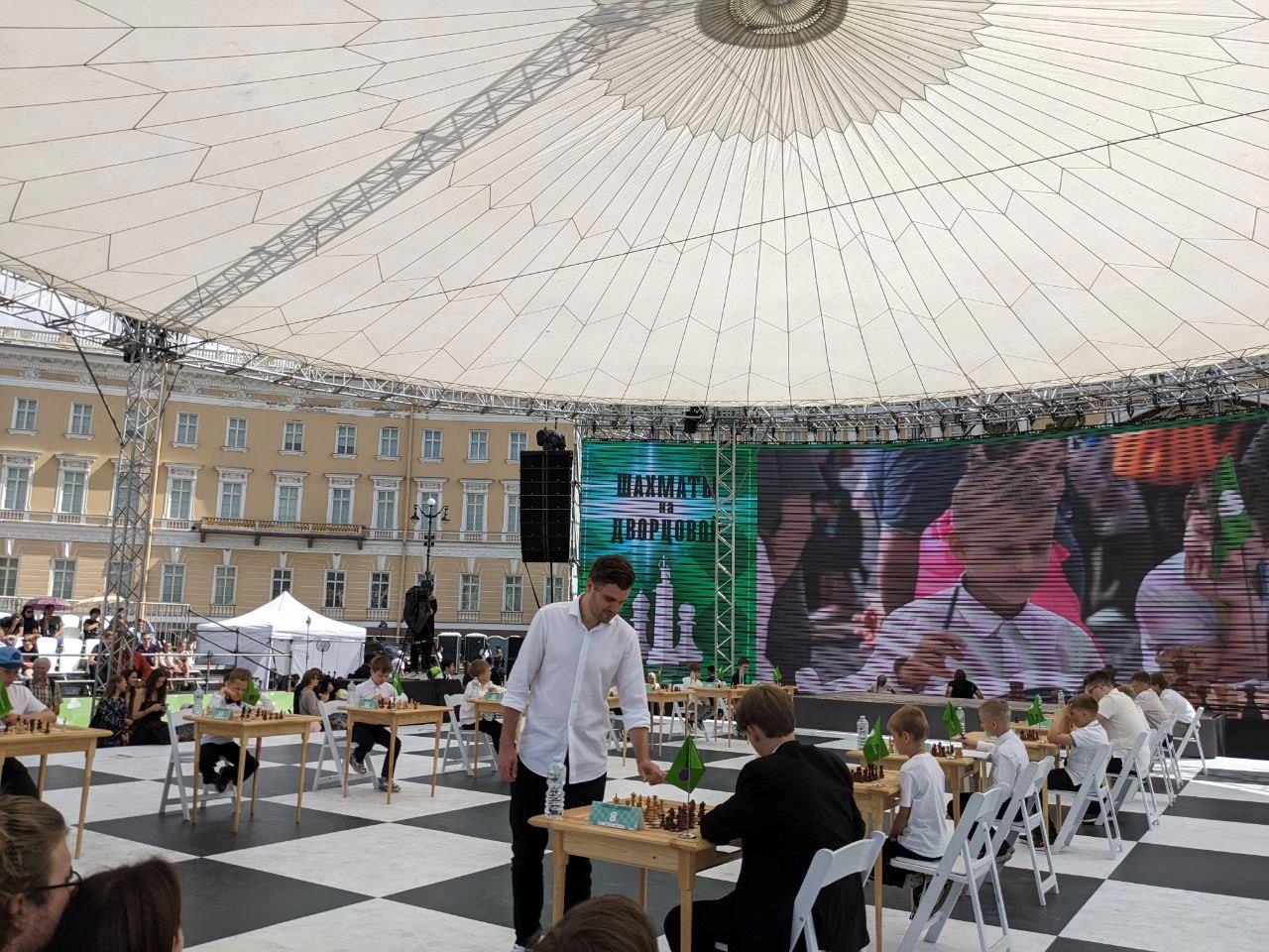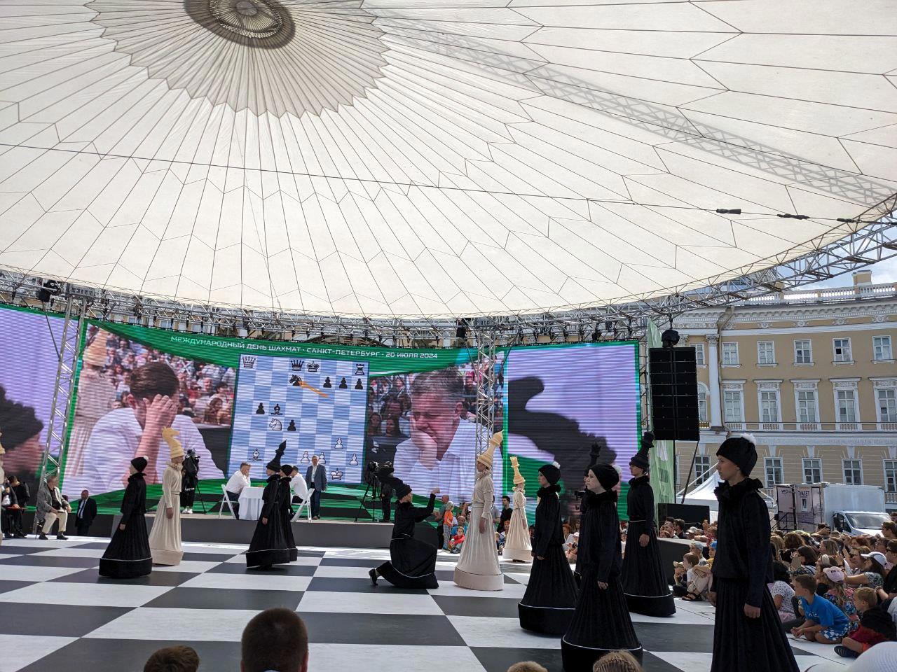 Автор: Владислав АлефКак любитель шахмат не мог пропустить данное мероприятие, проходившее сегодня на Дворцовой площади Петербурга. Его стержнем, безусловно, было представление, разыгранное гроссмейстерами Максимом Матлаковым и Александром Халифманом, а также артистами, исполняющими роли фигур. Тот же Матлаков после партии давал сеанс одновременной игры на шестнадцати досках детям-шахматистам. Для остальных детей было организовано множество мастер-классов (лепка, рисование и пр.), а все желающие испытать свои силы участвовали в блицтурнире.