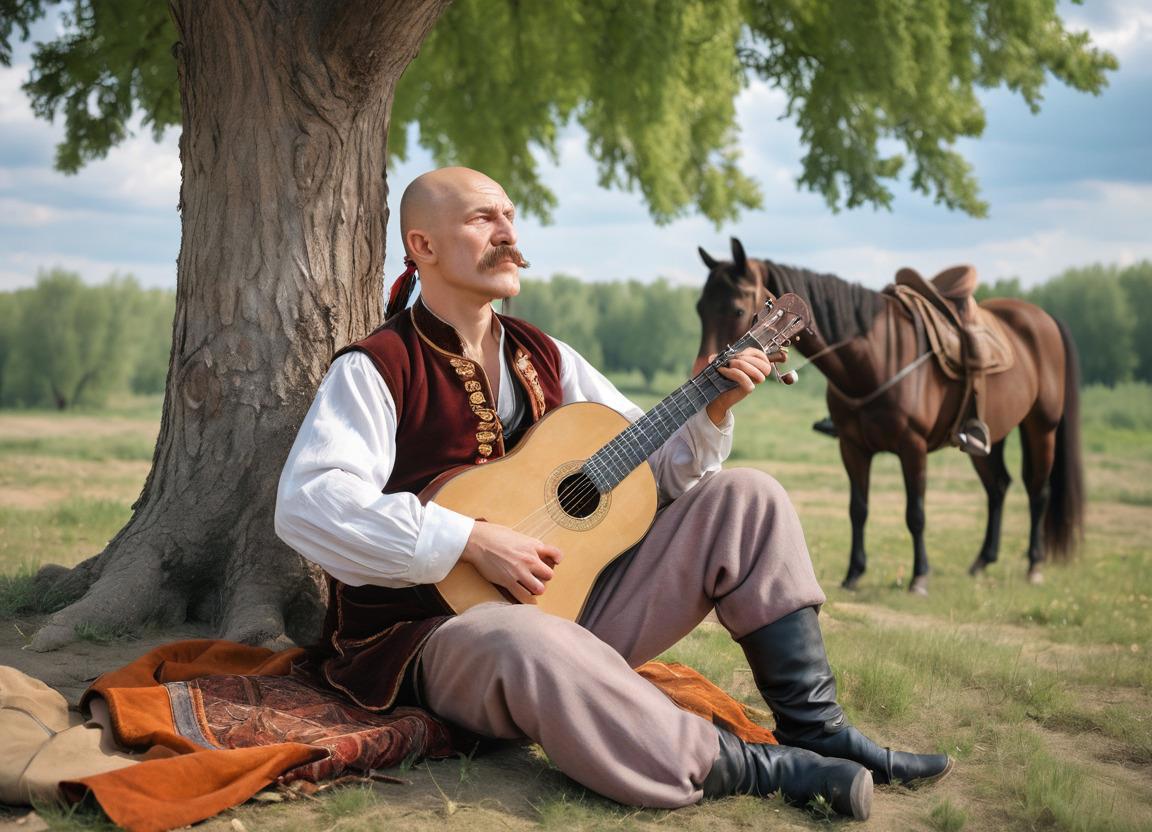 А это запорожский казак присел у дерева выкурить люльку (трубку) и спеть песню. В руках у него лютня. Должна быть.