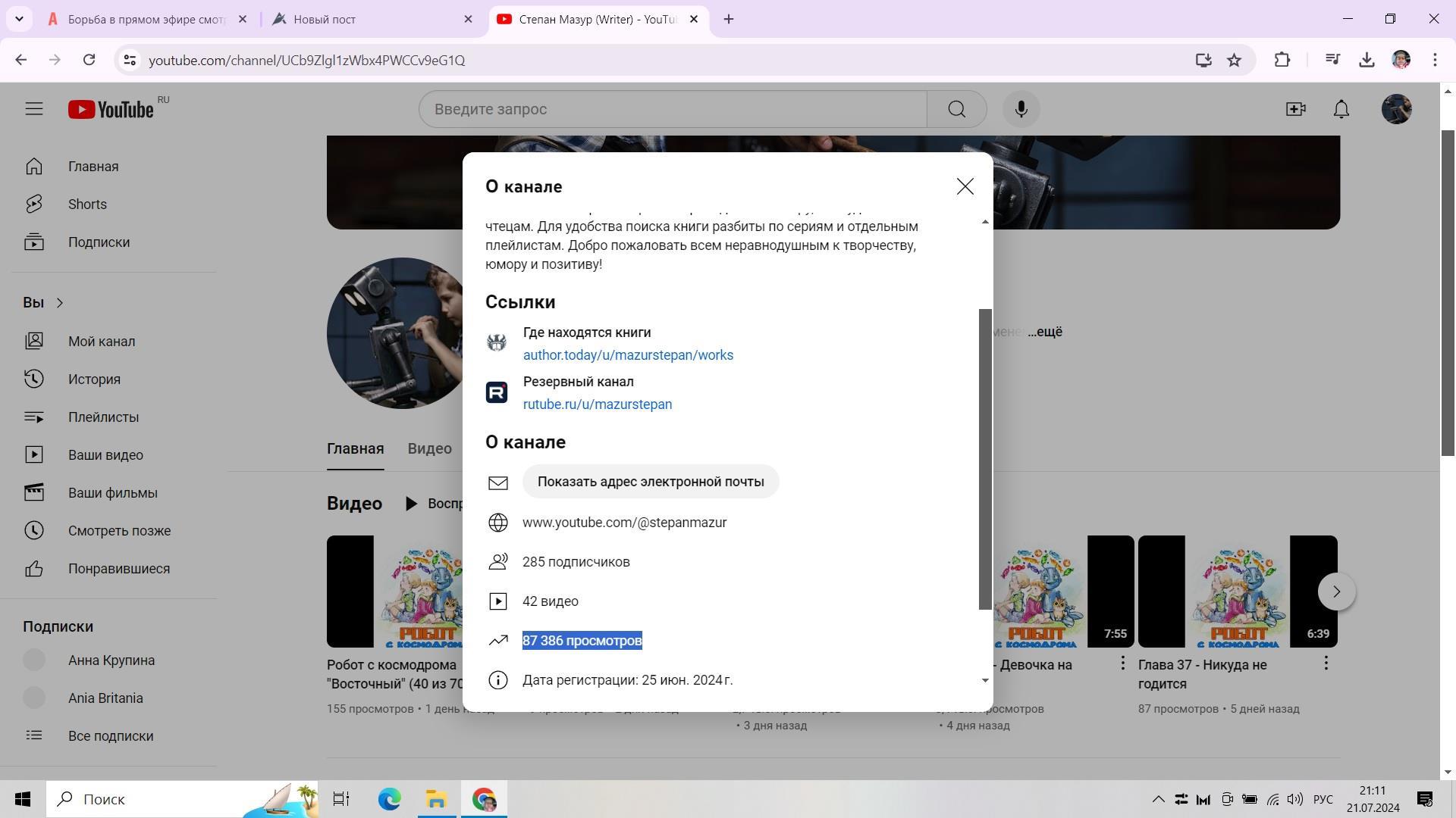В-третьих, авторский канал, стартовавший три недели назад на ютубе с первой детской книги Робот с космодрома "Восточный" к концу первого месяца плавно подбирается к 100 000 просмотра. Пара сотен подписчиков помогла насмотреть около 500 часов к этому часу, что для пятиминутных роликов-глав совсем неплохо.