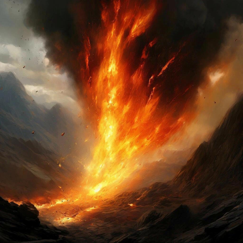 Горела  земля, спичками  вспыхивали деревья, ковром  стелился  огонь по  траве, подстерегая  нечаянную жертву. Из  жерла  вулкана с  грохотом  вылетала красная  лава, разлеталась  в воздухе  огненным  дождем и  срывалась  вниз с  горы, унося  глыбы камней  за  собой, в  сторону  когда-то мирного, счастливого  и  не знавшего  беды   государства. Словно  в разбушевавшихся  волнах  океана, исчезало  в  лаве все, что  не  успевало скрыться  от  ее зорких  глаз.  Она настигала  и  пожирала всех, кто  попадался  на ее  пути, не  щадя ни  сильного, ни  слабого. Она  не  делала поблажек, для  нее  все были  равны.