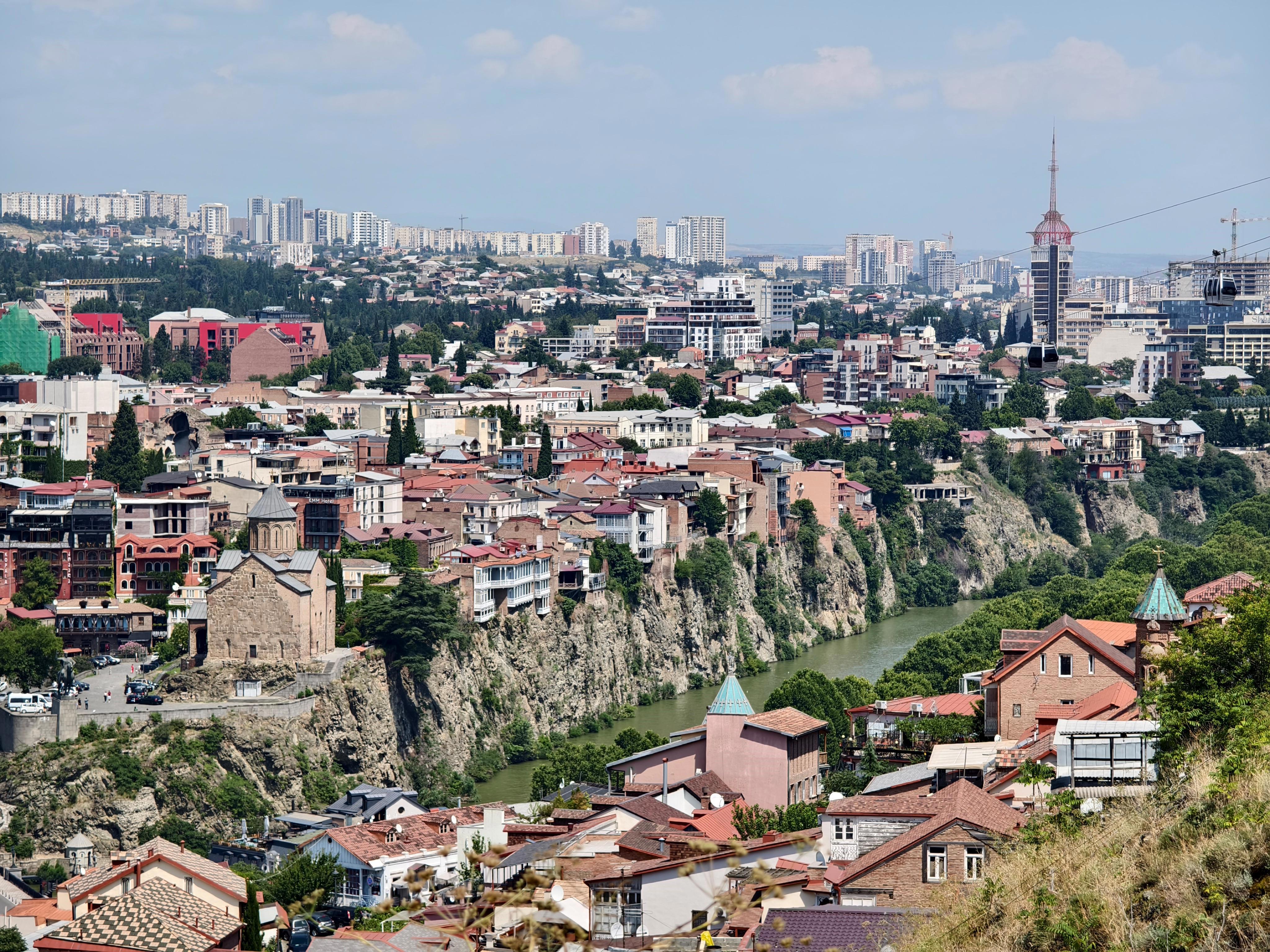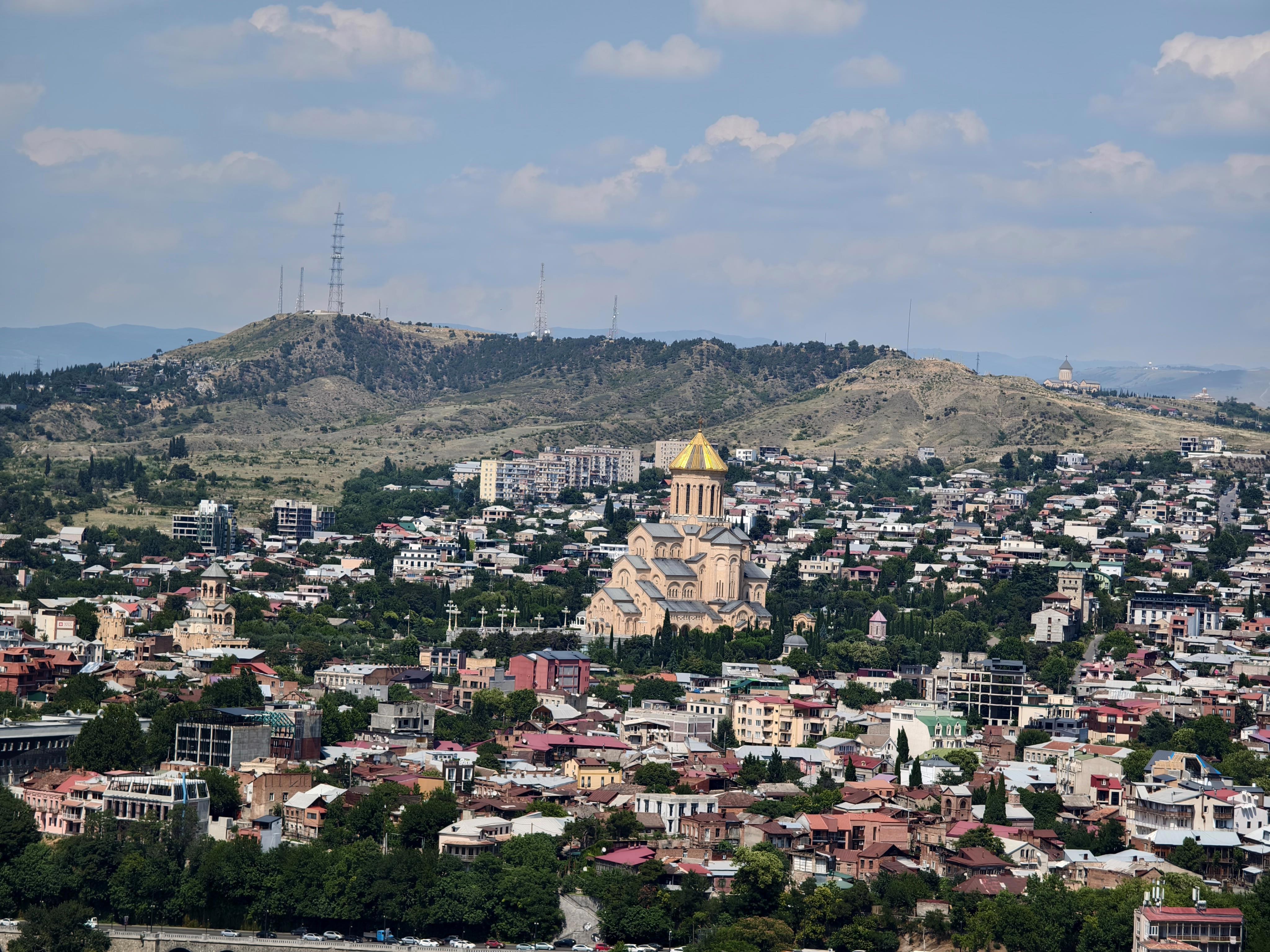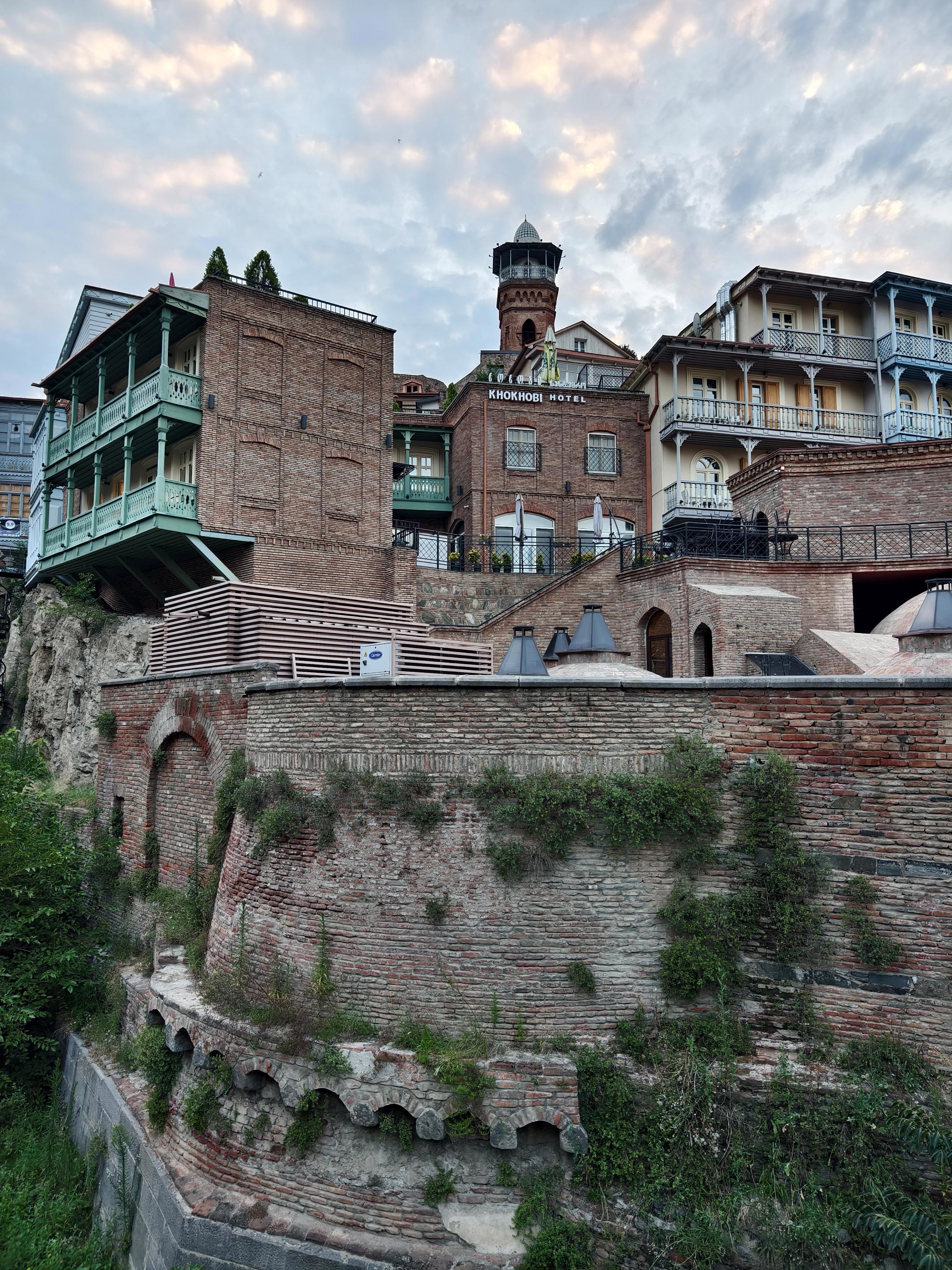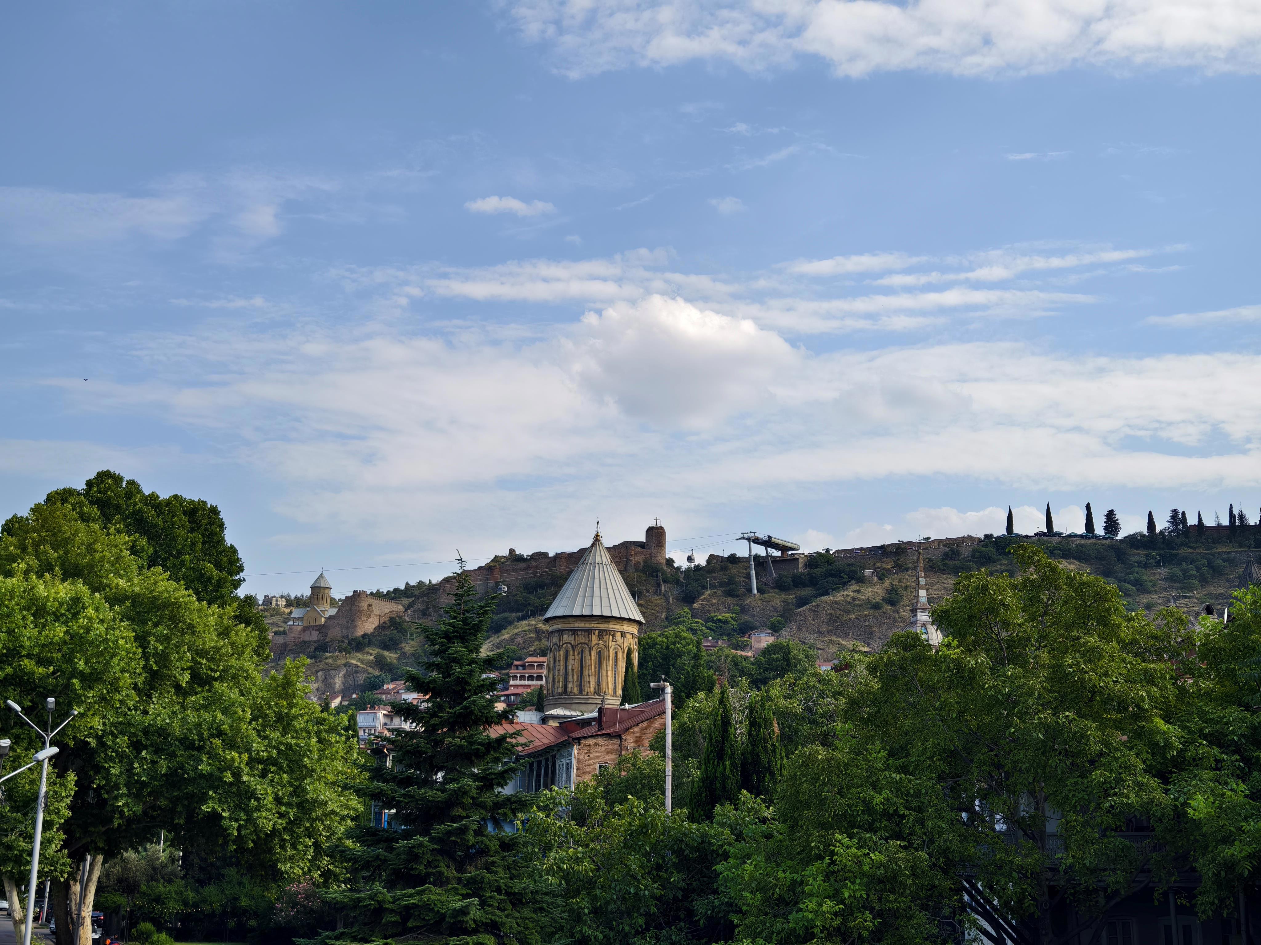 Вдалеке вижу дома, стоящие на обрыве и снимаю их на телеобъектив. Выглядит необычно и в кадр попадает ещё один храм а также современные застройки на заднем плане. Вот он какой разношёрстный город Тбилиси.