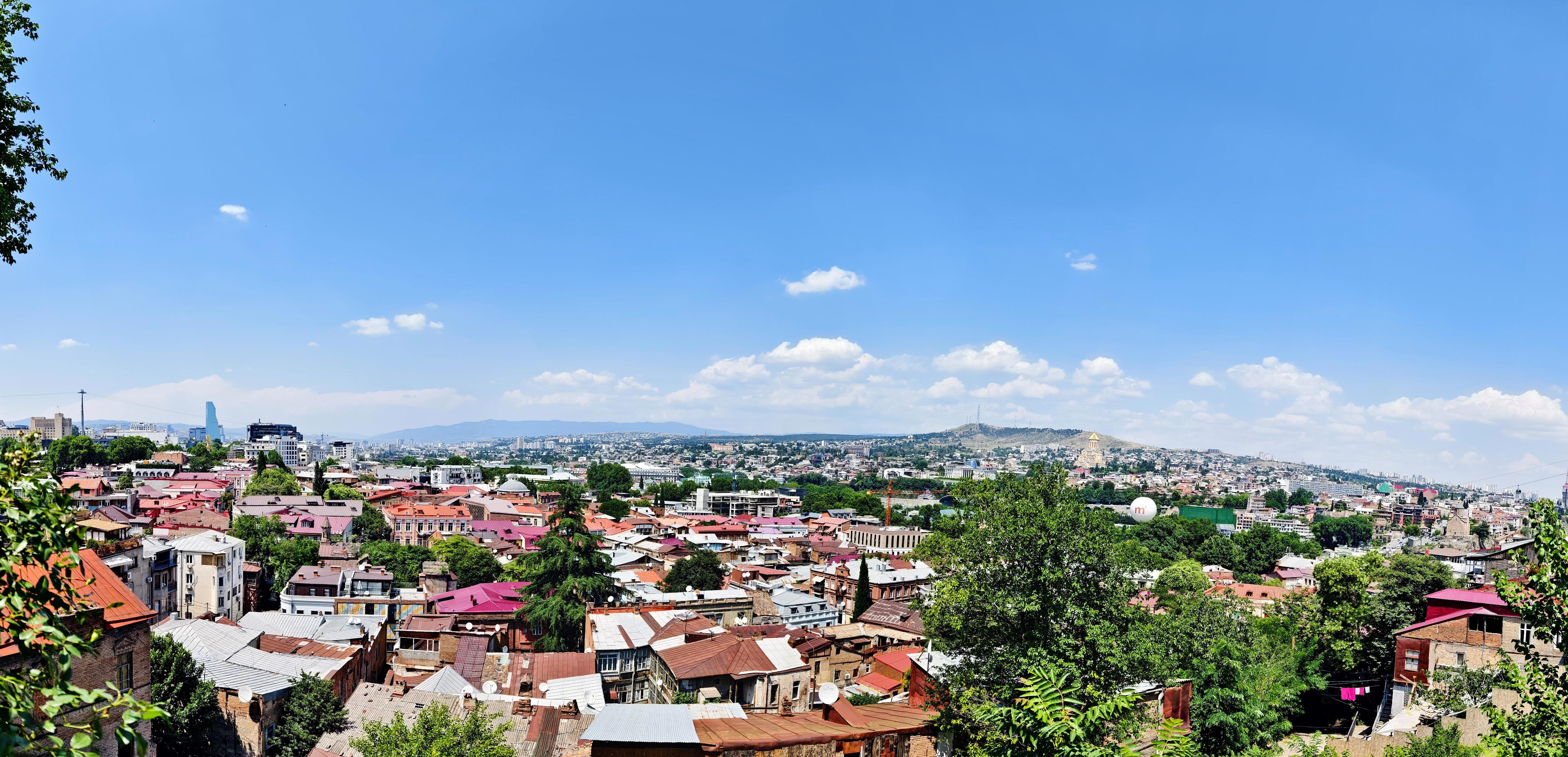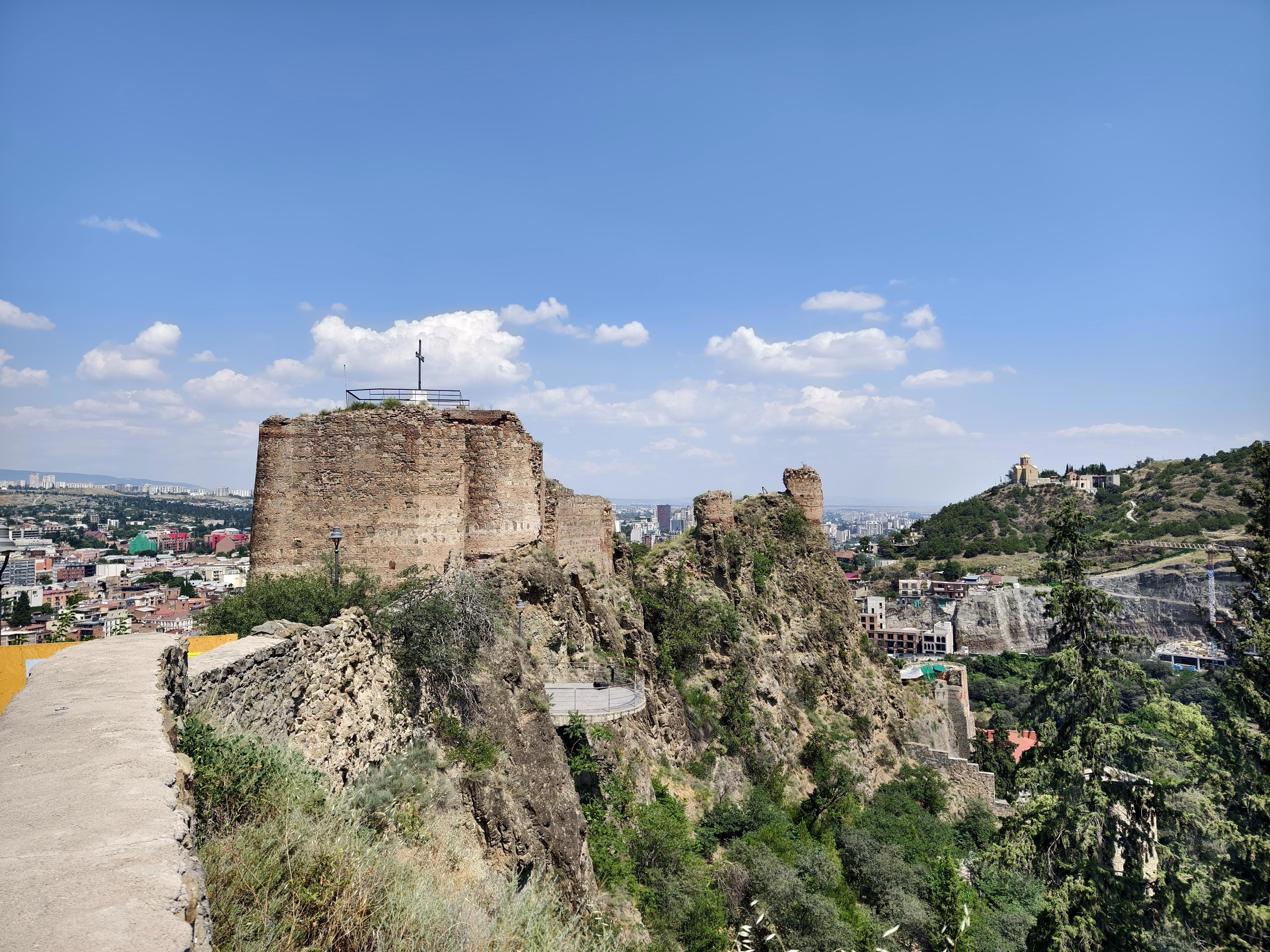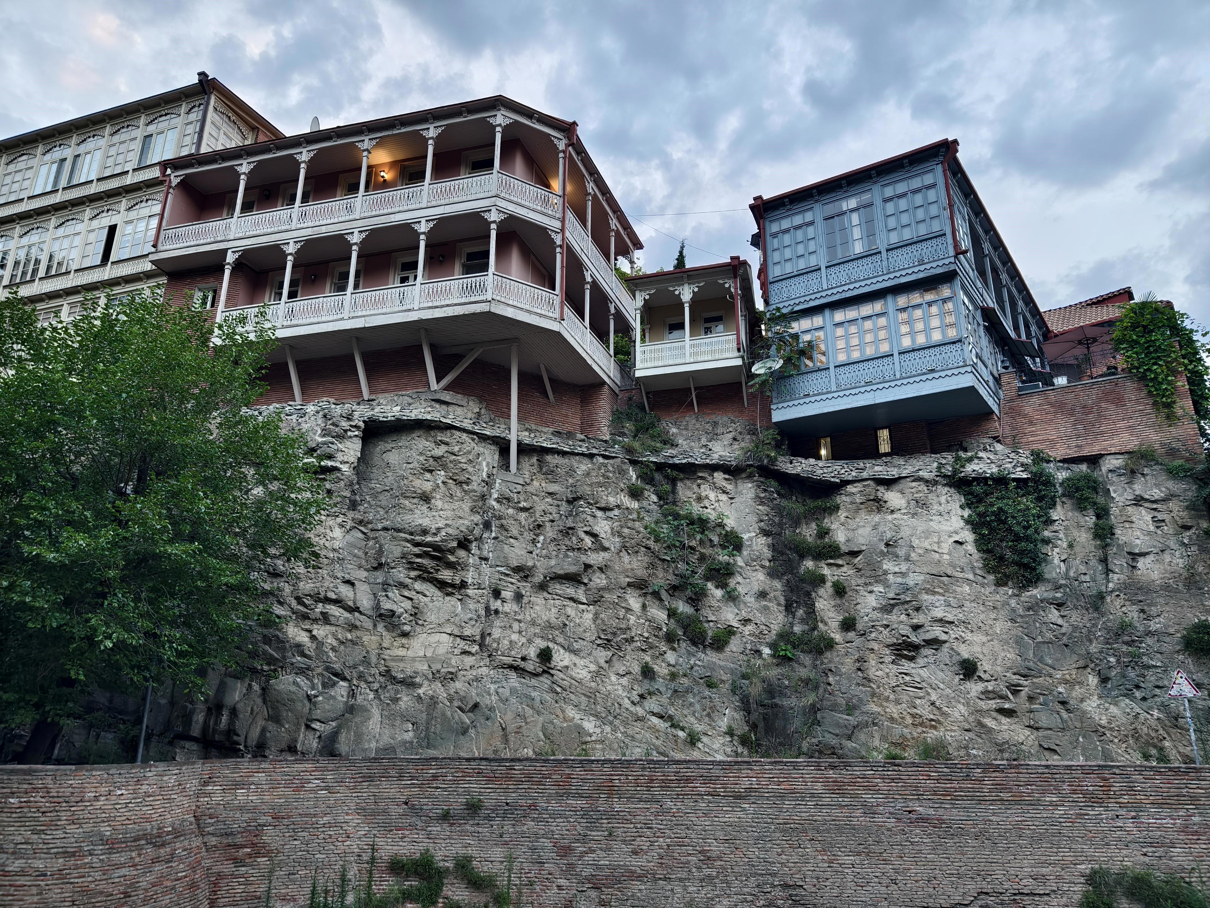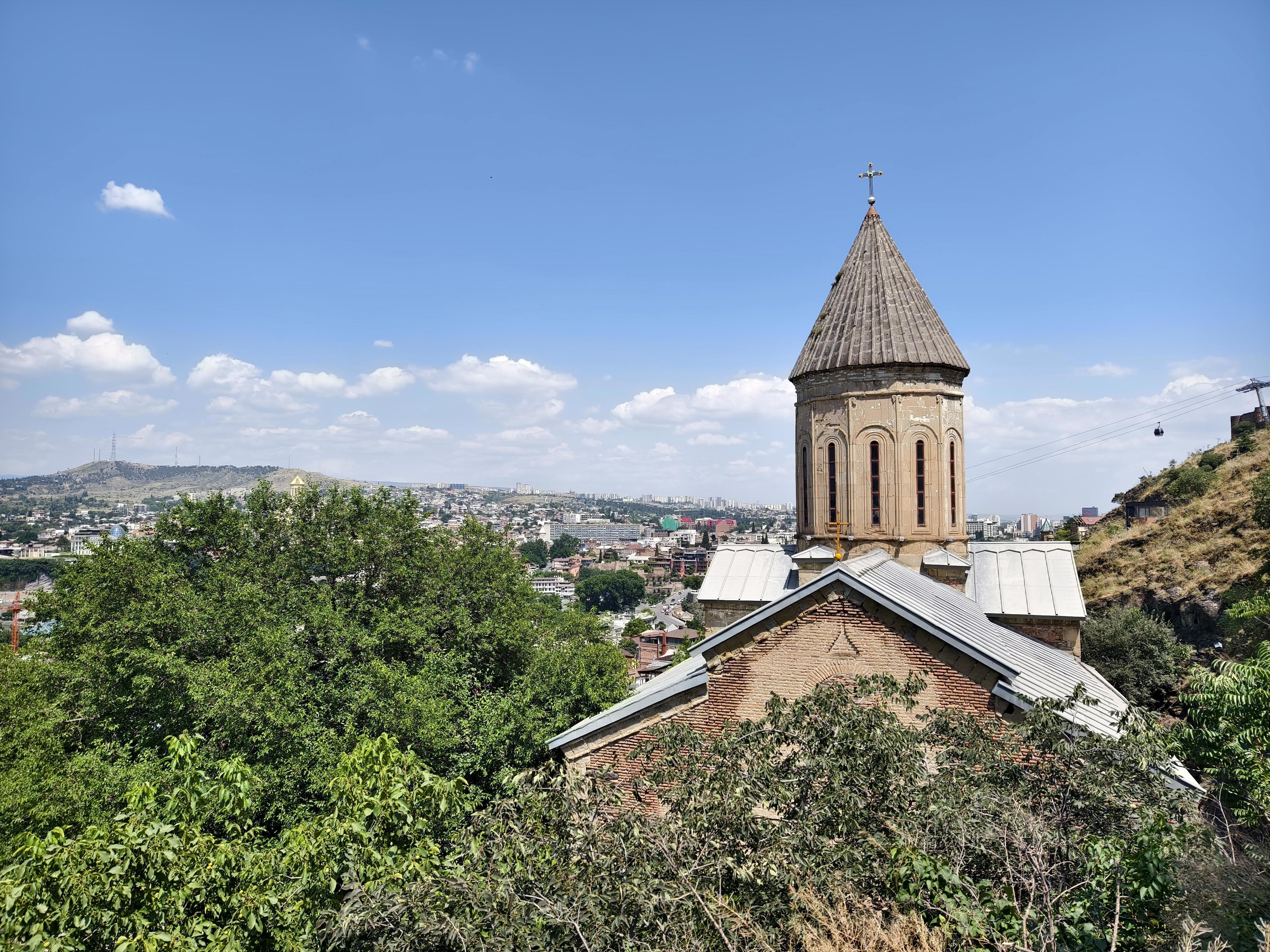 Вдалеке вижу дома, стоящие на обрыве и снимаю их на телеобъектив. Выглядит необычно и в кадр попадает ещё один храм а также современные застройки на заднем плане. Вот он какой разношёрстный город Тбилиси.