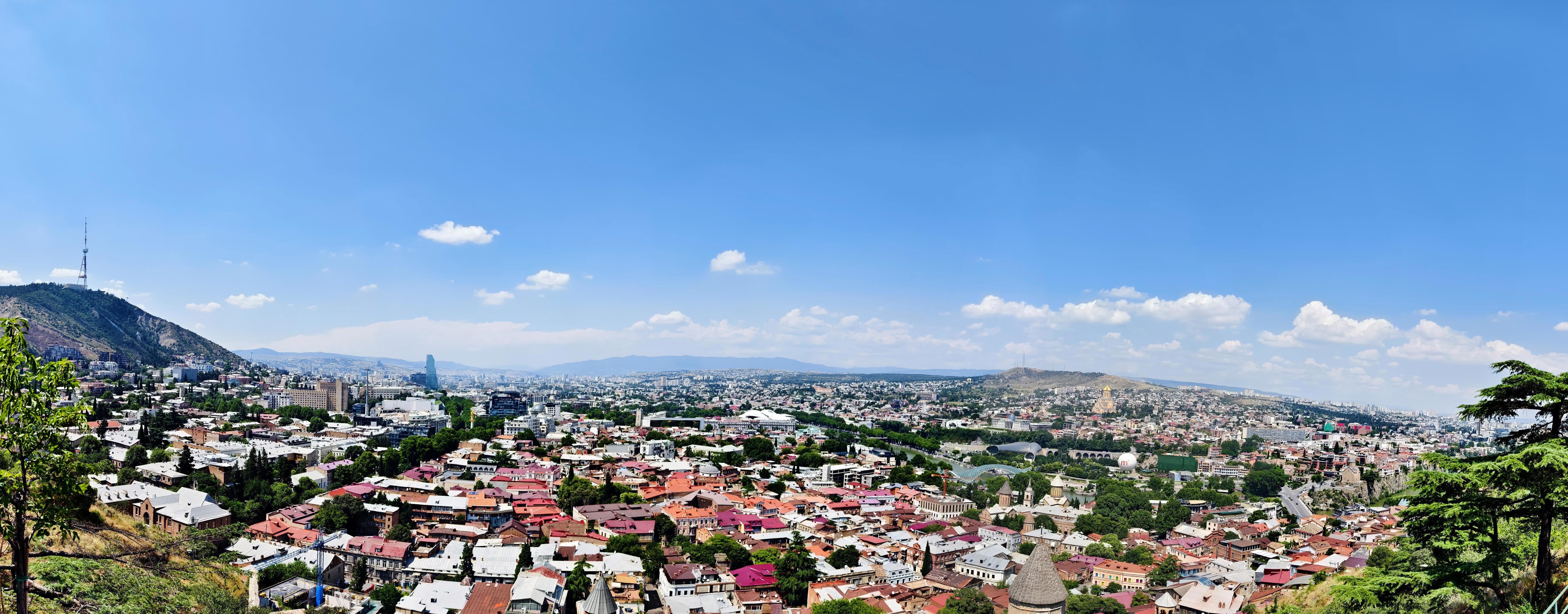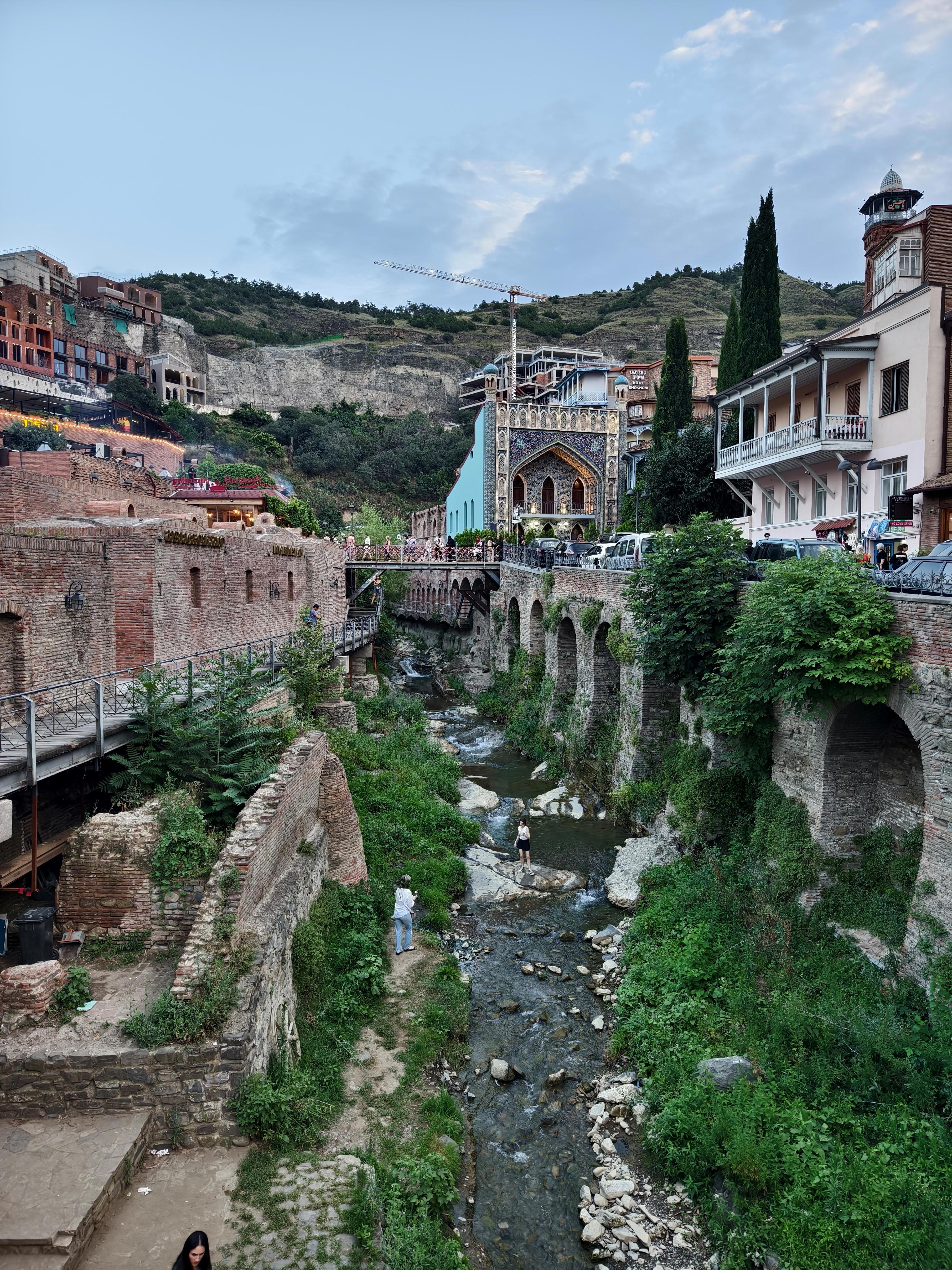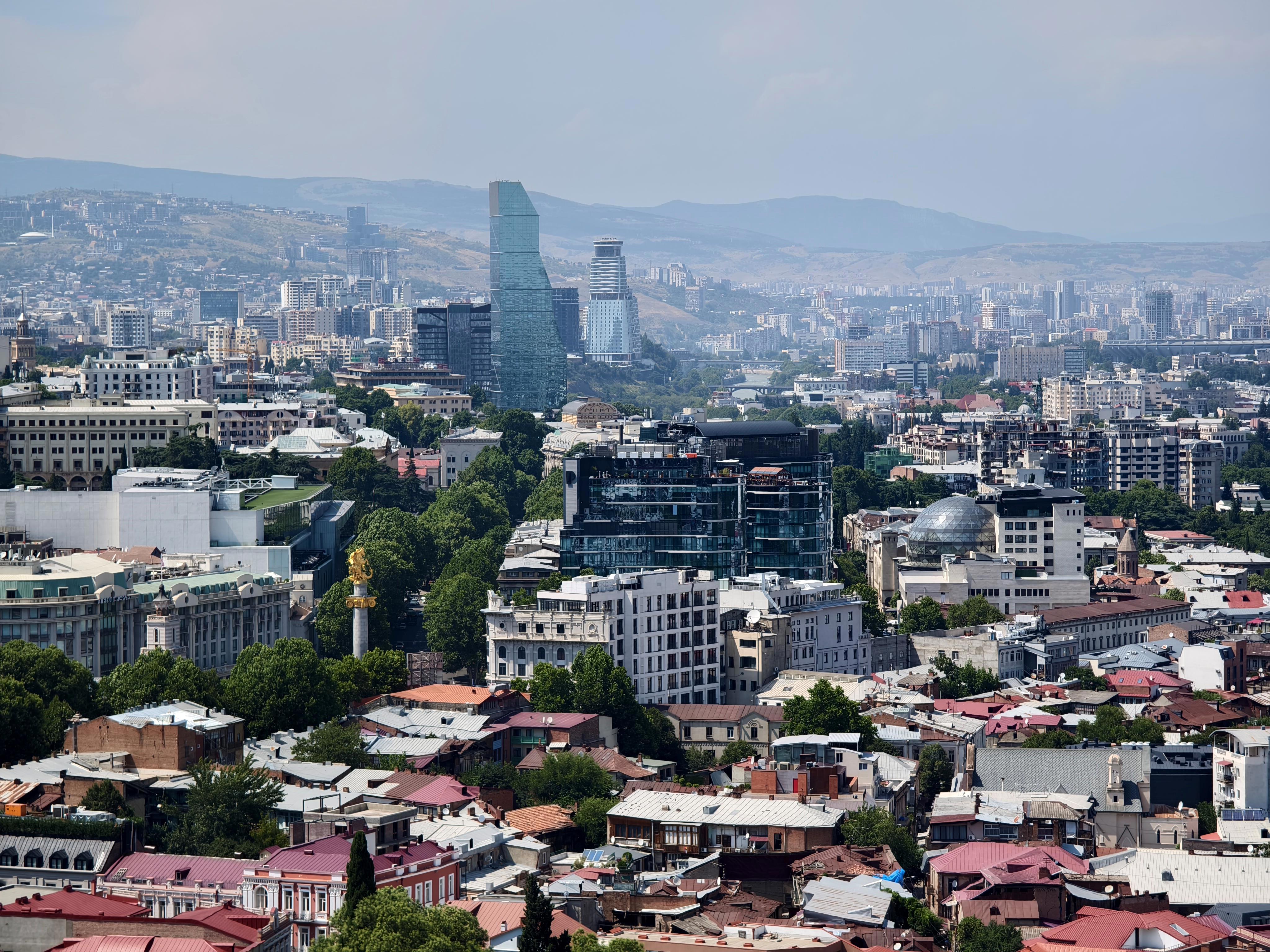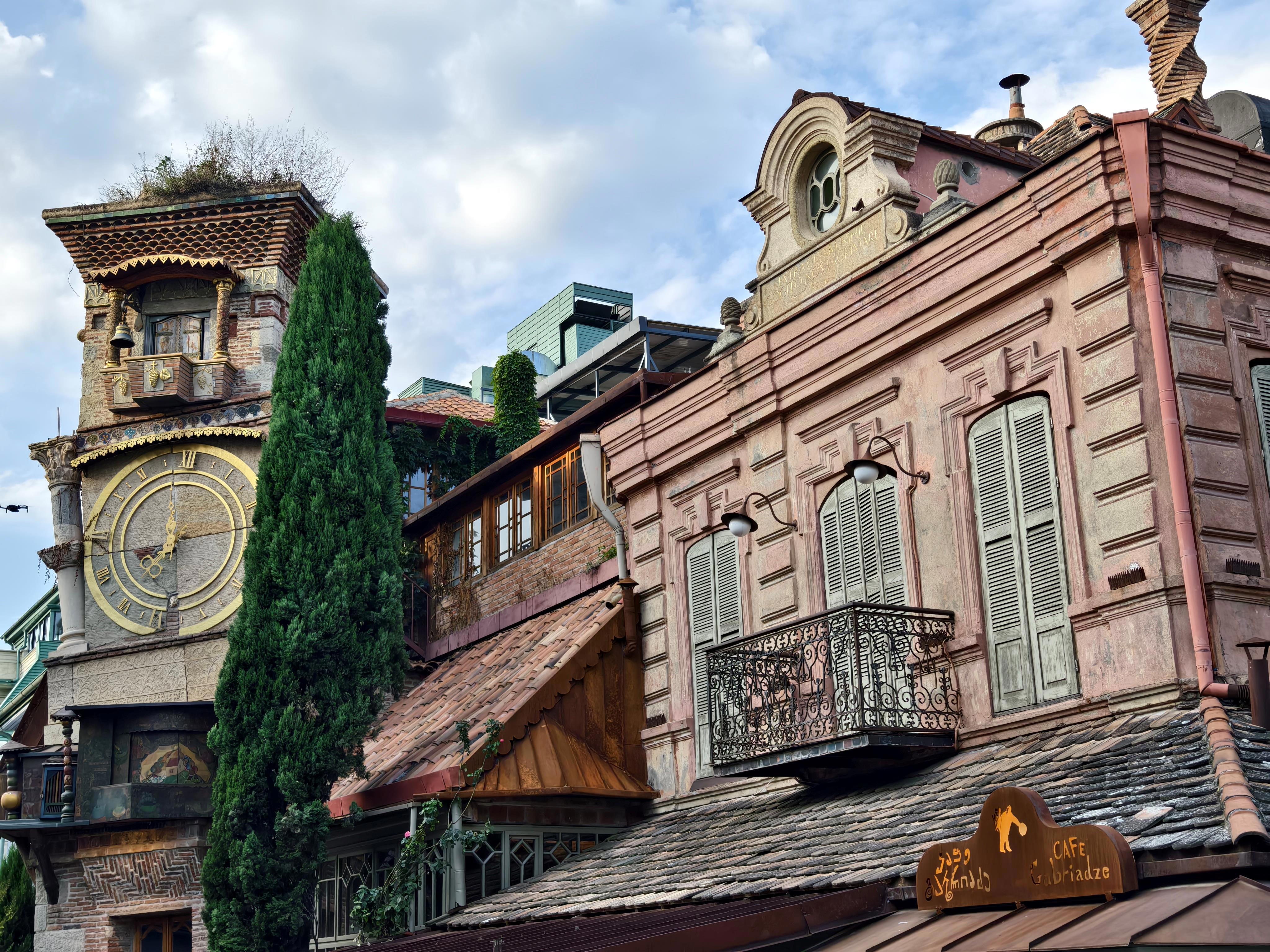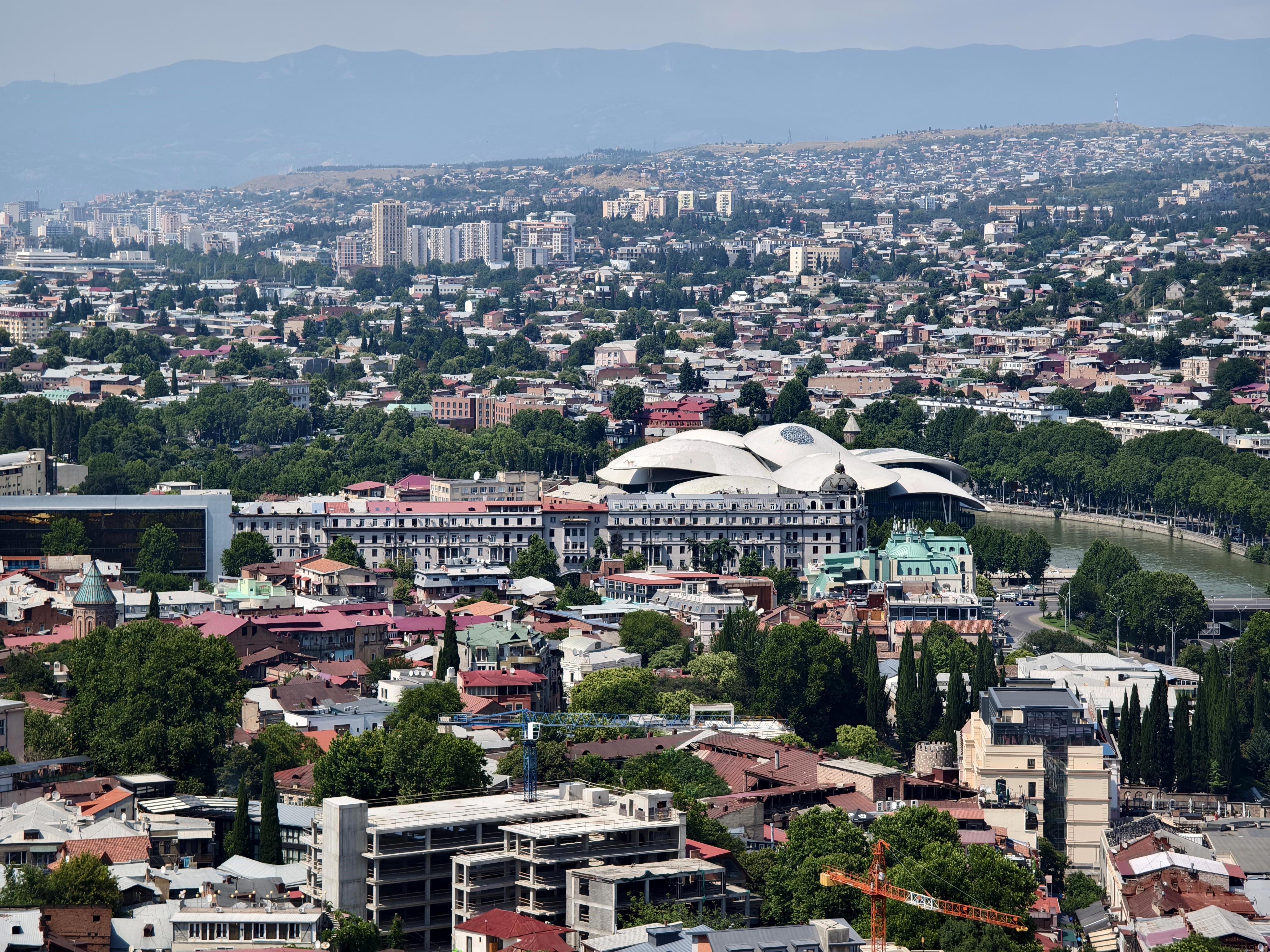 Вдалеке вижу дома, стоящие на обрыве и снимаю их на телеобъектив. Выглядит необычно и в кадр попадает ещё один храм а также современные застройки на заднем плане. Вот он какой разношёрстный город Тбилиси.