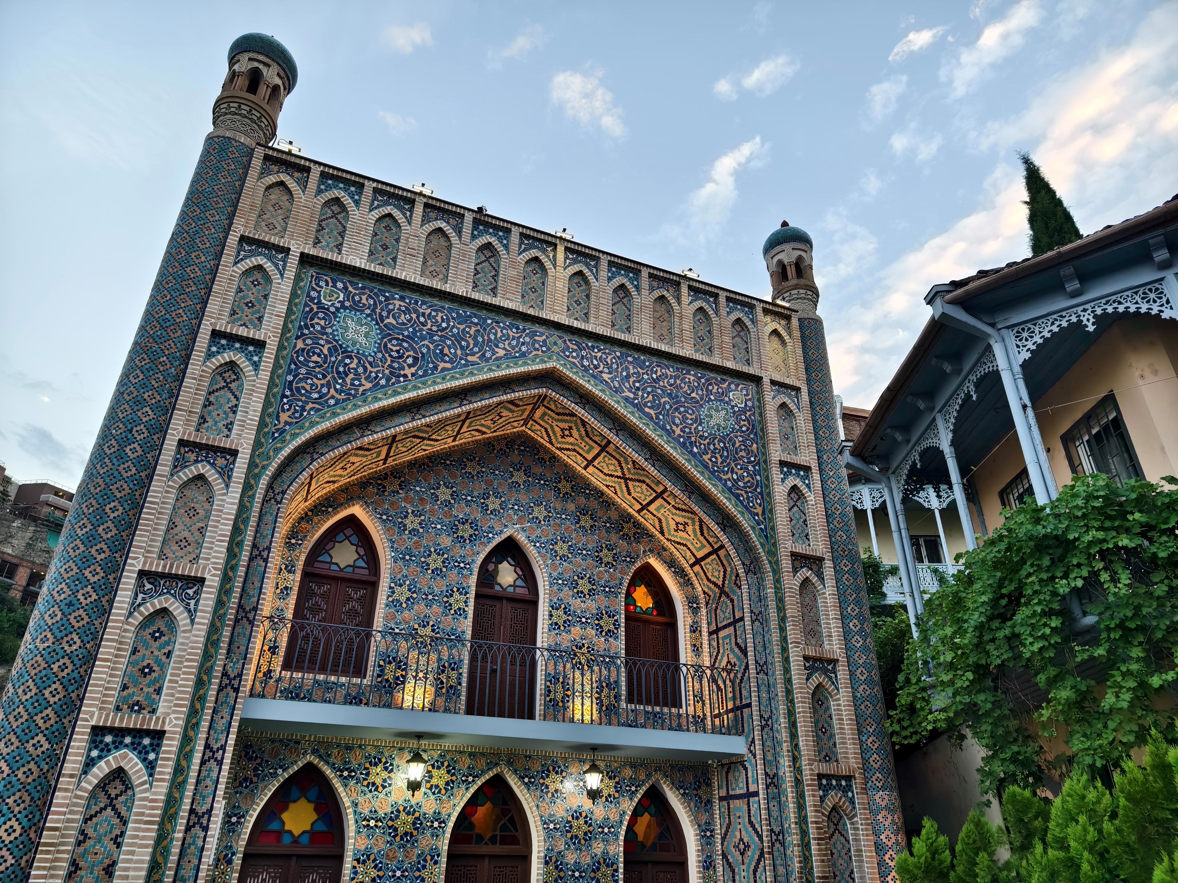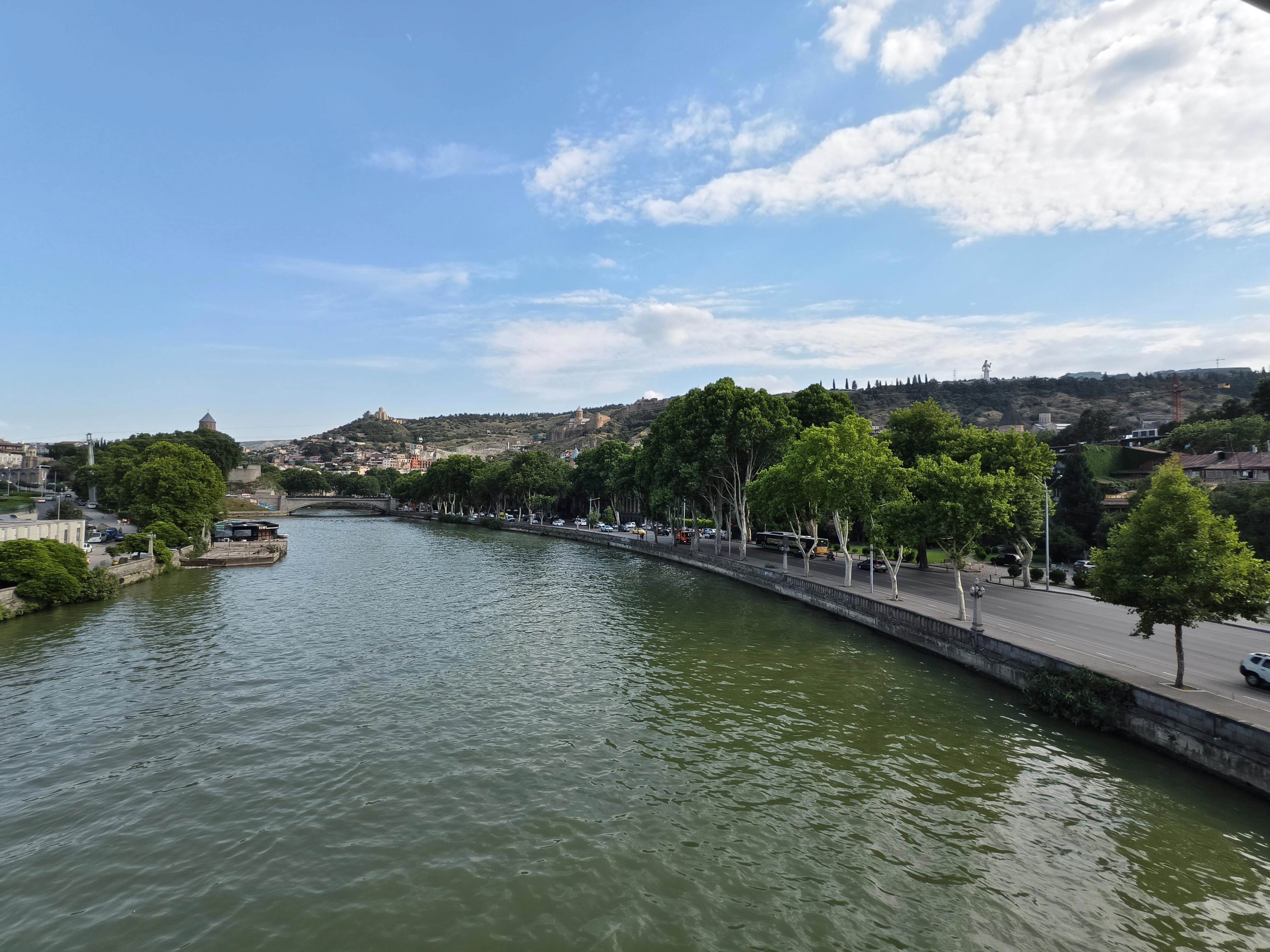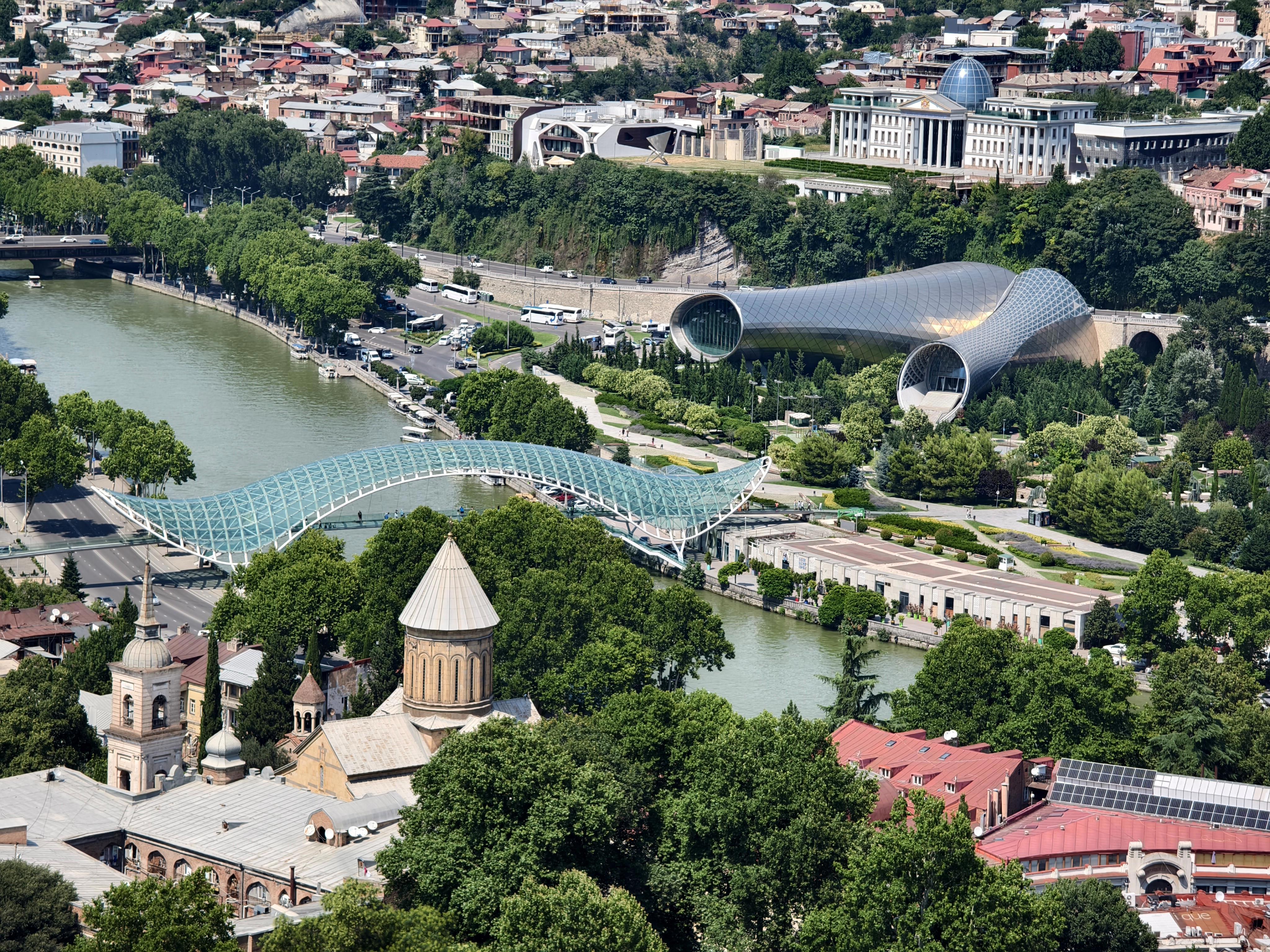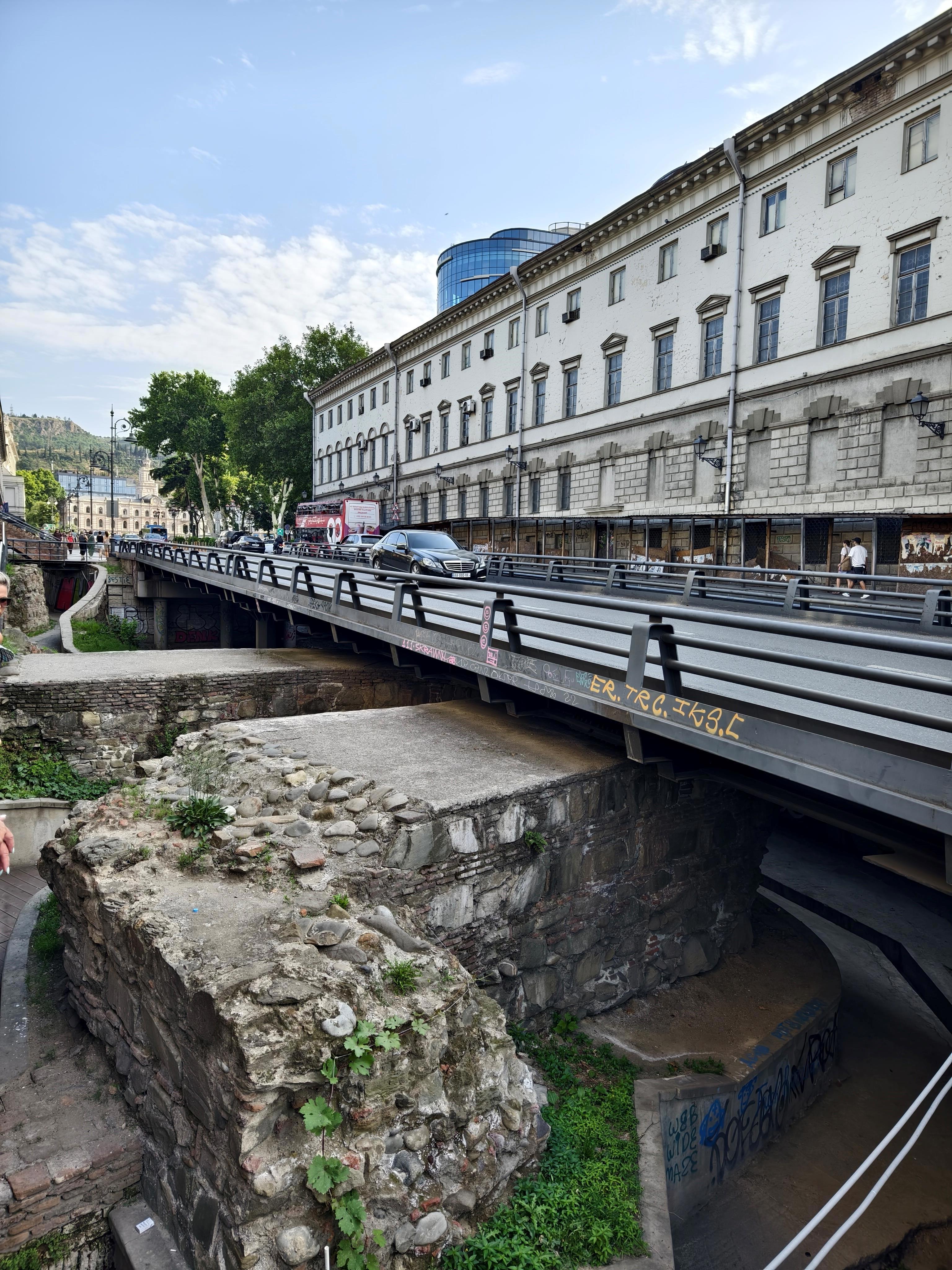 Вдалеке вижу дома, стоящие на обрыве и снимаю их на телеобъектив. Выглядит необычно и в кадр попадает ещё один храм а также современные застройки на заднем плане. Вот он какой разношёрстный город Тбилиси.