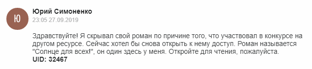 Автор: Юрий СимоненкоПочти четыре года назад я зарегистрировался на коричнево-розовом сайте. Не для сидения там, а просто чтобы было. Залил свеженаписанный роман и один рассказ, еще пост написал. За все время оставил три комментария. Позже текст романа я скрыл, т.к. того требовали правила одного конкурса, в котором участвовал здесь, на АТ. Ну, скрыл и скрыл, и забыл про тот сайт. И вот чет дернуло меня на днях зайти туда снова. Увидел скрытый роман. Дай, думаю, напишу в поддержку, попрошу чтобы открыли. Все равно же уже залит, так может кто из тамошних лырщиц захочет почитать. Написал...