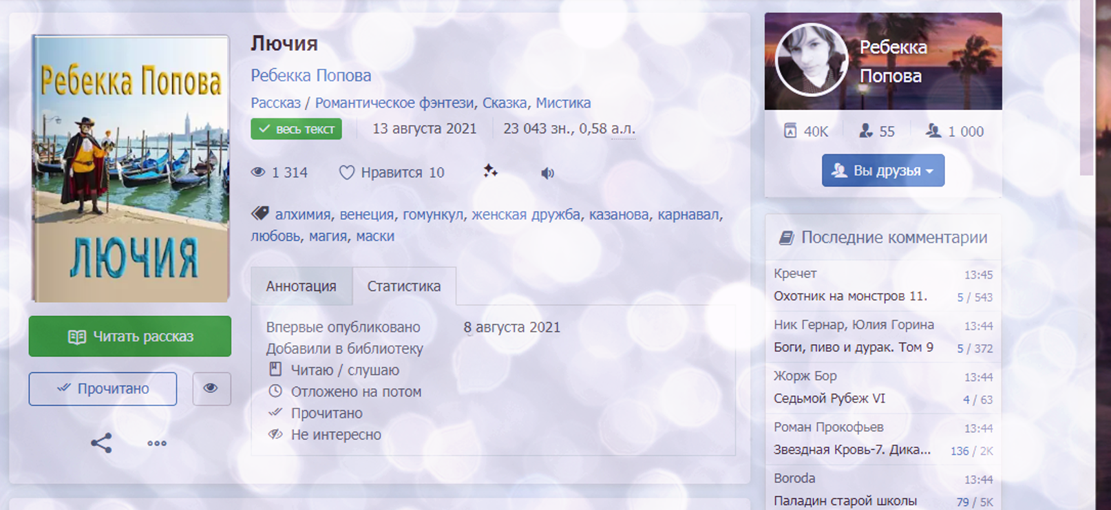 Автор: Til WinterДождь за окном. Самое время почитать что-нибудь искреннее и глубокое. Рассказ Ребекки Поповой "Лючия" написан 17 лет назад. За это время образы набрали силу времени и стали хранителями автора в его собственной Вселенной.