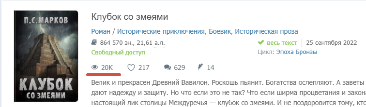 Автор: Павел МарковРоман «Клубок со змеями» набрал 20к просмотров. Да, книге в следующем месяце уже два года, кто-то такие цифры за неделю собирает, но все равно приятно.