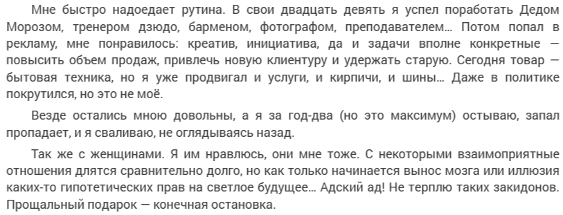 Все оставались им довольны. Надо полагать, и женщины, с которыми он расстался. Женщины вообще всегда довольны теми, с кем в итоге расстаются. Как и работодатели. Особенно довольны самим фактом расставания, видимо. По крайней мере, сам герой в этом точно уверен.