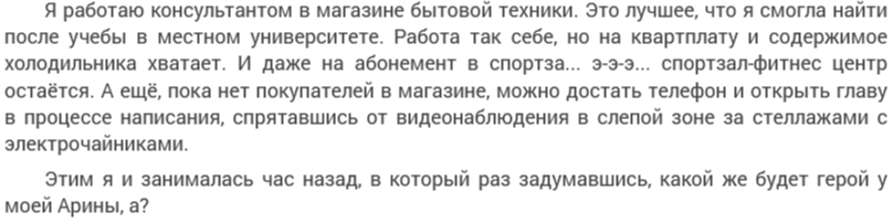 И Рафис делает работу на совесть - то есть его деятельность приносит плоды: лайки, подписчиков, и покупки. Потому что наш раскрасавец Рафис не просто альфа-оборотень, нашедший истинную пару, он ещё и (о совпадение!) специалист по рекламе, так что у нас не фэнтези, но он - волшебник! Спец в рекламе даже кирпич раскрутит! А ещё он не только спец в рекламе. Спец в женской психологии - тоже. В мужской - не особо, раз вымышленных мужиков сначала сгоряча за настоящих принял, зато вот пожилую, умудрённую жизнью женщину сыграть - легко и запросто. Или дело в том, что Наташу легко в этом плане обмануть, откуда ей знать, какие они - пожилые женщины? Тем более, иной раз в сети пенсионерок легко с подростками спутать. Но у Рафиса всё получается. Да один сам тот факт, что он в это впрягся - полез в женский коллектив читать типично женские книжки. Думаю, если бы ему не нравилось - он бы в этом сообществе не сидел. Но тут такая сказка - нашёлся мужчина, который разделяет женские увлечения женским чтивом и писевом. В такое ещё можно поверить, если бы не было всех остальных сопаденией, вроде встречи в реале, а ещё готовности при всём при этом ходить на коротком поводке, о чём мы узнаем дальше.