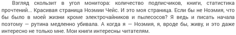 Но Рафис придумывает способ быть с любимой рядом, если не телом - то душой. Он создаёт женский аккаунт Марь-Иванны - такой тётеньки-училки, доброй и чуткой, и очень правдоподобно играет эту роль (на минуточку, роль пожилой женщины!!! Не, ну точно, Рафис спец только по женской психологии), и приходит к Ноэмии Чейс в роли преданной читательницы, начинает писать коммы и просто общаться о личном, притворяясь тётенькой, причём тётенькой не простой, а у которой интересы совпадают с Наташиными. Например, по части французской культуры. Заодно создаёт сообщество имени Ноэмии Чейс и начинает заниматься продвижением Наташеных книжек. Надеюсь, не надо объяснять, что раскрутка книг - это большая работа. Тяжёлая и в физическом, и в психологическом плане. Потому что чтобы что-то раскрутить - нужно тратить много времени и на модерацию раздела, и на размещение завлекающих постов, и на взаимолайки с дружественными сообществами и людьми, потому что если их не тормошить, они о тебе забудут. Или не забудут, но не будут активничать и способствовать дальнейшему продвижению.