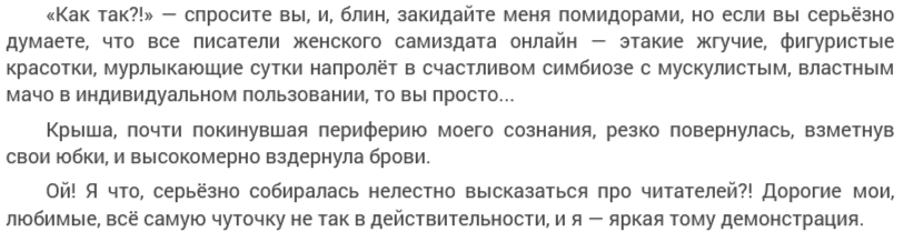 Но потом она вдруг спохватывается, что чуть не назвала своих драгоценных читателей дураками, которые чего-то там не того себе навоображали. Но с другой стороны, вот прочитала я эту историю, и разве эти гипотетические читатели, которые тоже суть плод фантазий героини, не правы? Может, насчёт фигуристости - и нет, а вот про мурлыканье о счастливом симбиозе с арбузерами - очень даже да!