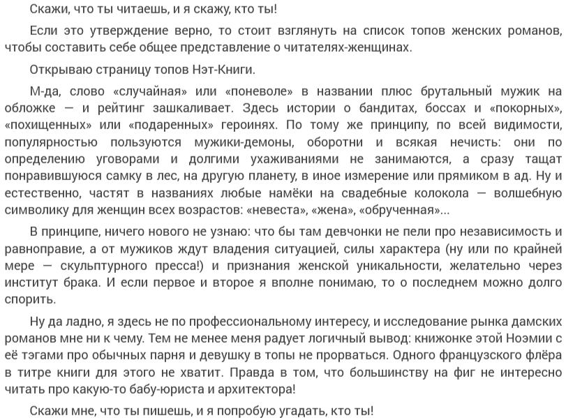 Тут же автор озвучивает и тенденции на книжном рынке. Правда, это уже взгляд другого персонажа, того, который будет (СПОЙЛЕР) женихом Наташи, его зовут Рафис. Хотя, какой тут спойлер? По закону жанра именно он по всем признакам подходит на эту роль и в данном случае автор законов жанра не нарушает и шаблонов не рвёт. Как должно быть - так и будет. И один из признаков, укладывающийся в закон жанра, что этот персонаж появляется довольно быстро и раскрывается подробно, автор даже (как это водится) пишет от его лица, и вот от его лица взгляд на тенденции книжного рынка: