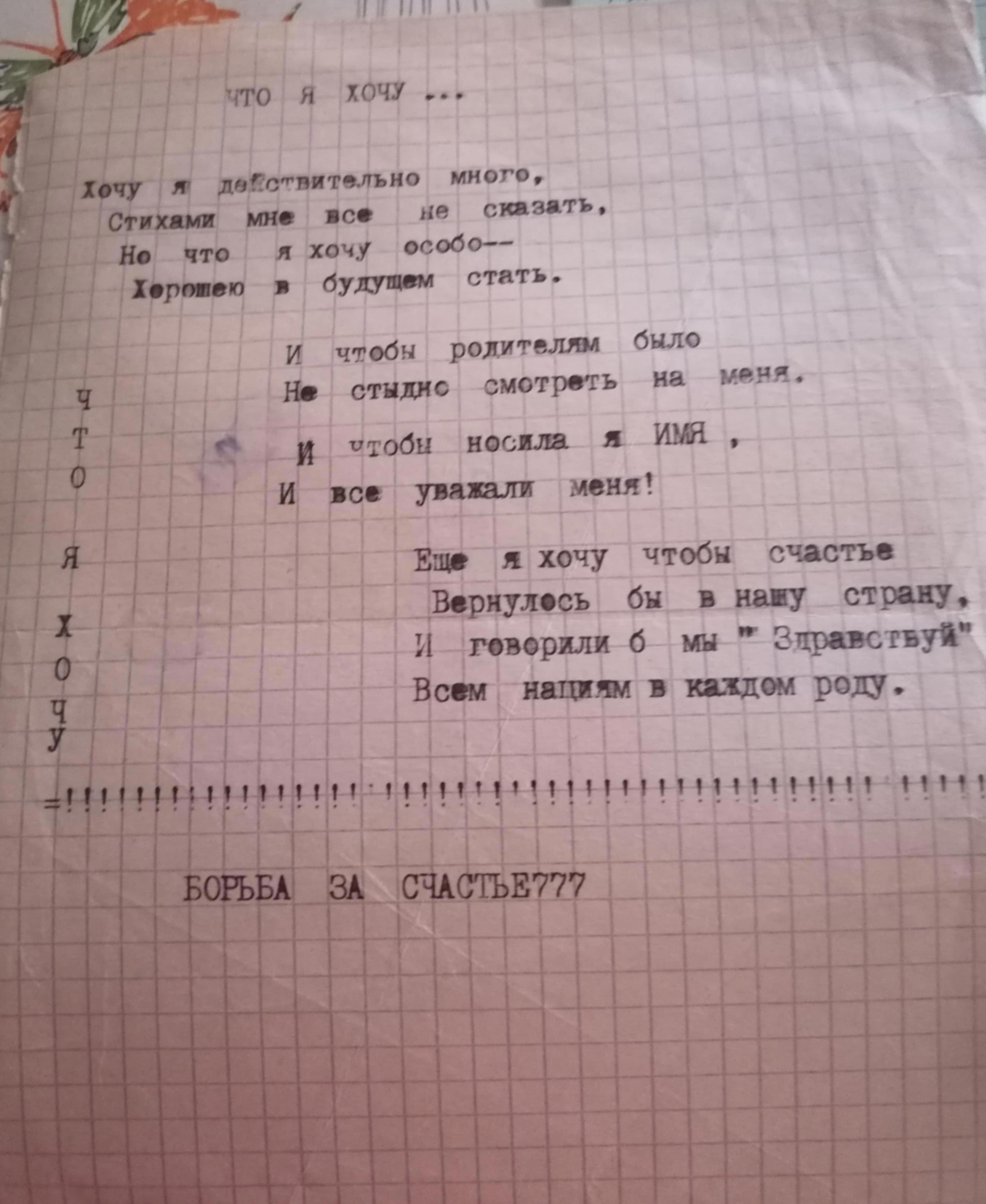 А ещё я нашла коробку со старыми тетрадями, стихами и прозой, когда мне было лет 12-13 максимум. Тогда у нас была ещё печатная машинка, и я его набрала. Хочется верить, что что-то сбылось.