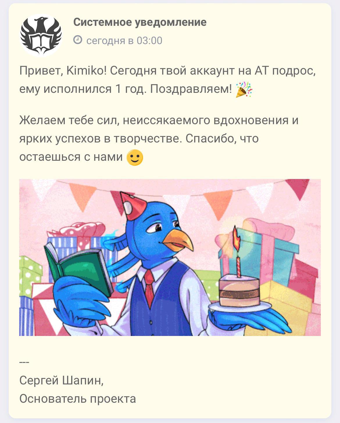 Конечно, писать я стала АТшные книги пару месяцами позже, но с момента регистрации… 365 дней. Даже мурашки по коже, неужели время пролетело так быстро?..