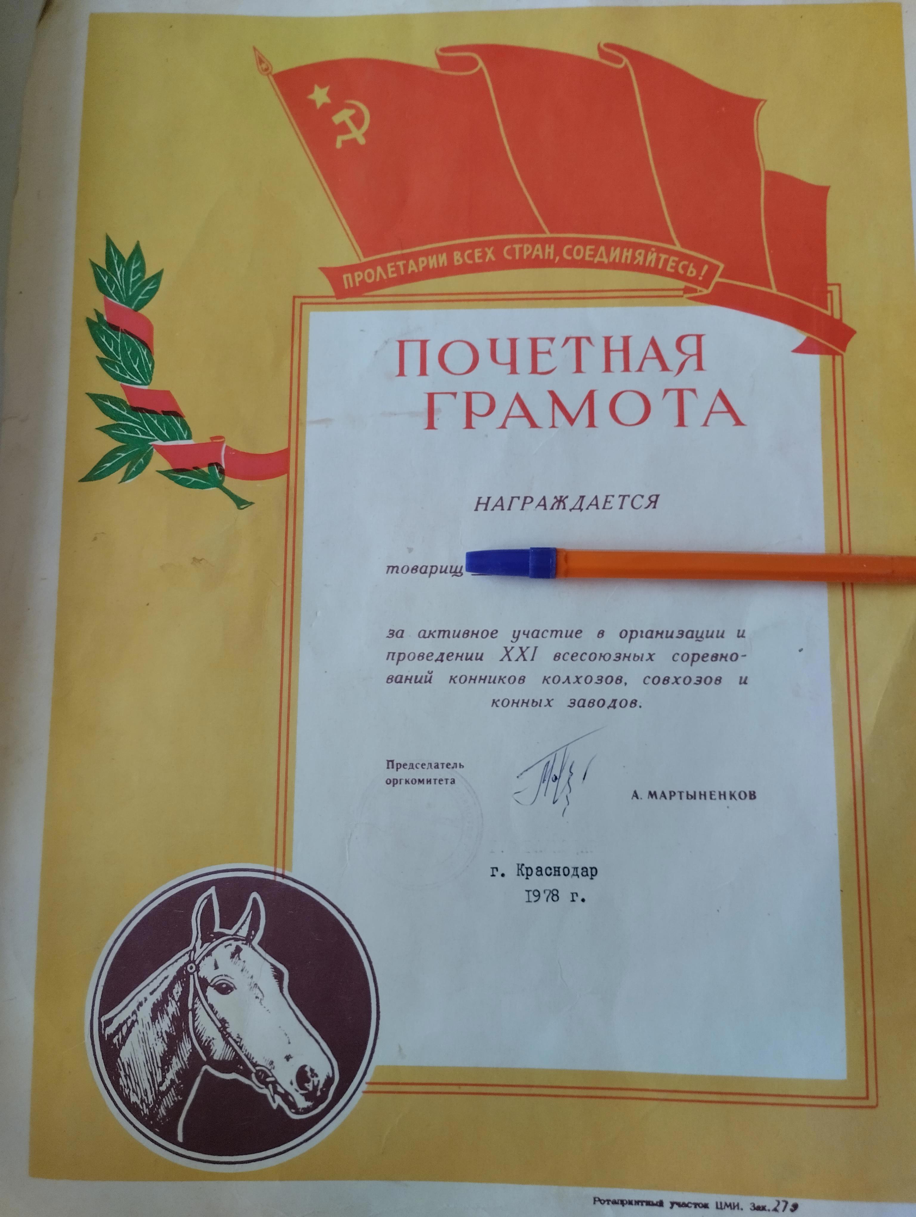 Привёз грамоту в институт, чтобы в деканате не сильно возмущались, что пару дней занятий пропустил. Собственно, стройотрядовцев освобождали от колхоза, но на пару дней задержался, потому что очень долго ехали из Краснодара по железной дороге.