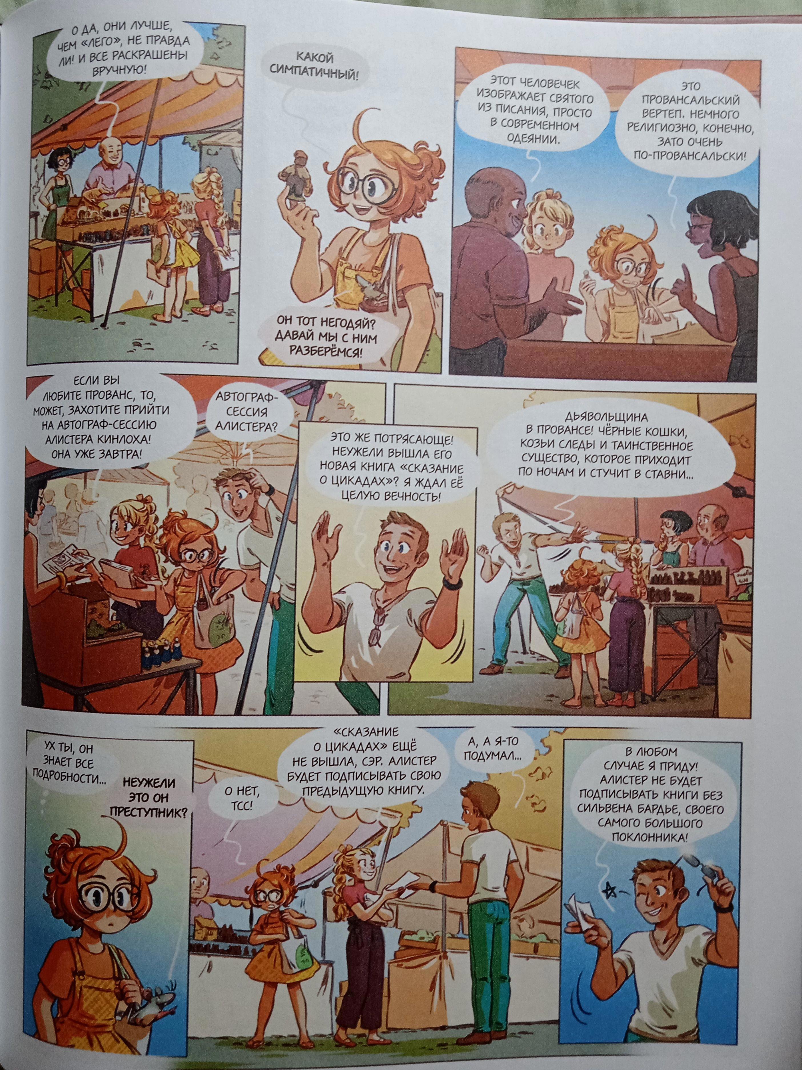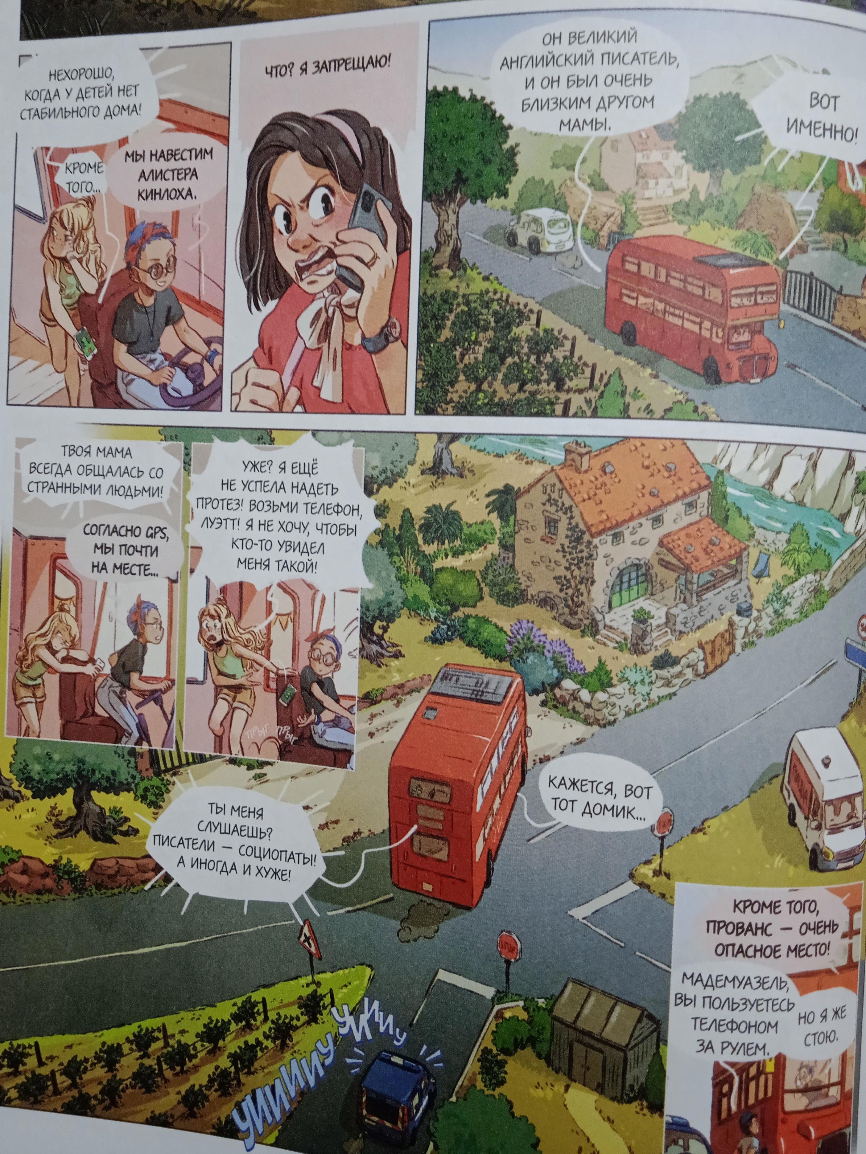 Показательный момент - на чтение каждого томика комикса у меня ушло примерно столько же времени, сколько ушло бы на книжку такого же размера, без картинок. Суть истории - три девочки-сироты во главе со старшей, совершеннолетней, путешествуют по Франции на лондонском автобусе, переделанном в книжный магазин, торгуя книгами в маленьких городках и деревнях. Младшая, рыжая Эльфи, тайно изучает доставшуюся от погибшей матери книгу, способную творить волшебство - но только если зарядить её историями! Так что приходится девочке-подростку начинать карьеру писательницы, хехе. Атмосфера "маленькой Европы" очень уютно передана, в том числе за счёт стиля рисовки, французский колорит подаётся походя и ненавязчиво, от чего только лучше воспринимается.