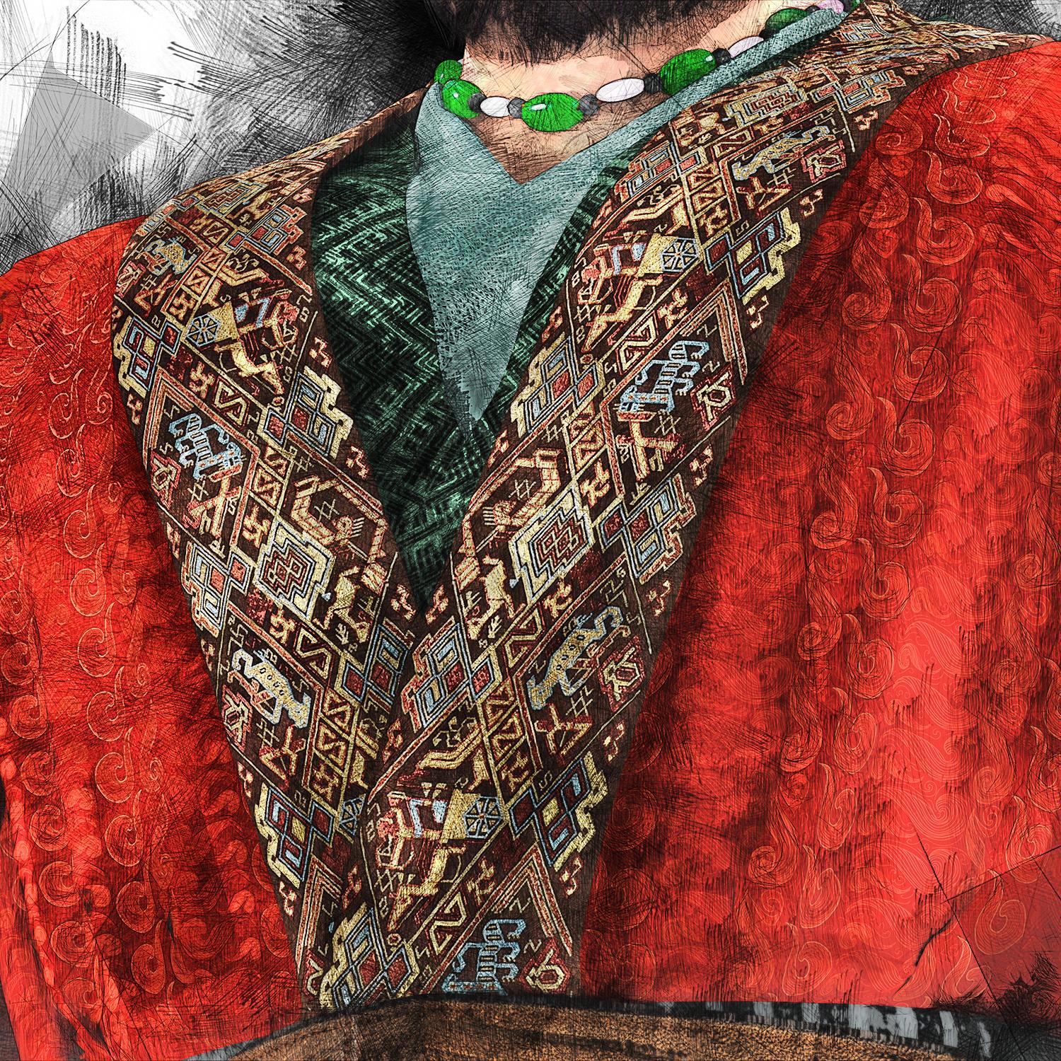 В моделировании одежды для Сян Юя использована тесьма с орнаментом 田猎纹 (сцены охоты) времени Воюющих Царств (5-3 в. до н.э.) Подробнее об этом орнаменте было здесь: