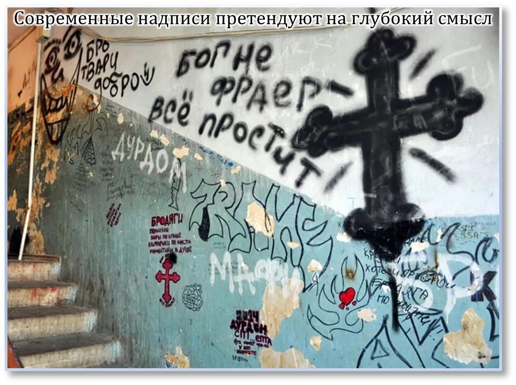 Вообще, подобные надписи во множестве были начертаны в подъездах. Но мелко и под лестницей. Оттуда можно было узнать имена популярных незамужних девушек. Обычно, если некрасива, то «уродка», а если наоборот, то «дура». Ведь известно, что девчонка или умная, или красивая — так считали парни в том возрасте. На этажах не писали. Вдруг потом жениться вздумает на этой «дуре» или «уродке»?