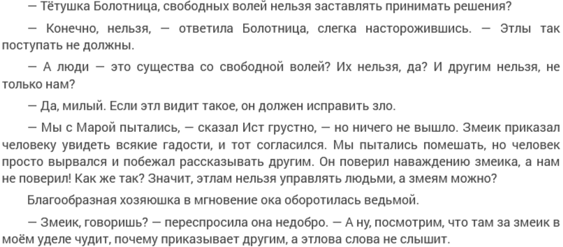 Может быть, все этлы разные, кто-то соблюдает законы, кто-то нет, но тогда хотелось бы понять, каковы сами законы, и есть ли они вообще? А есть ли у Этлов свои желания, и можно ли действовать в угоду этим желаниям? И если они есть - то какие? Потому что не понимая этого, сложно найти в действиях Болотницы какой-то здравый смысл.