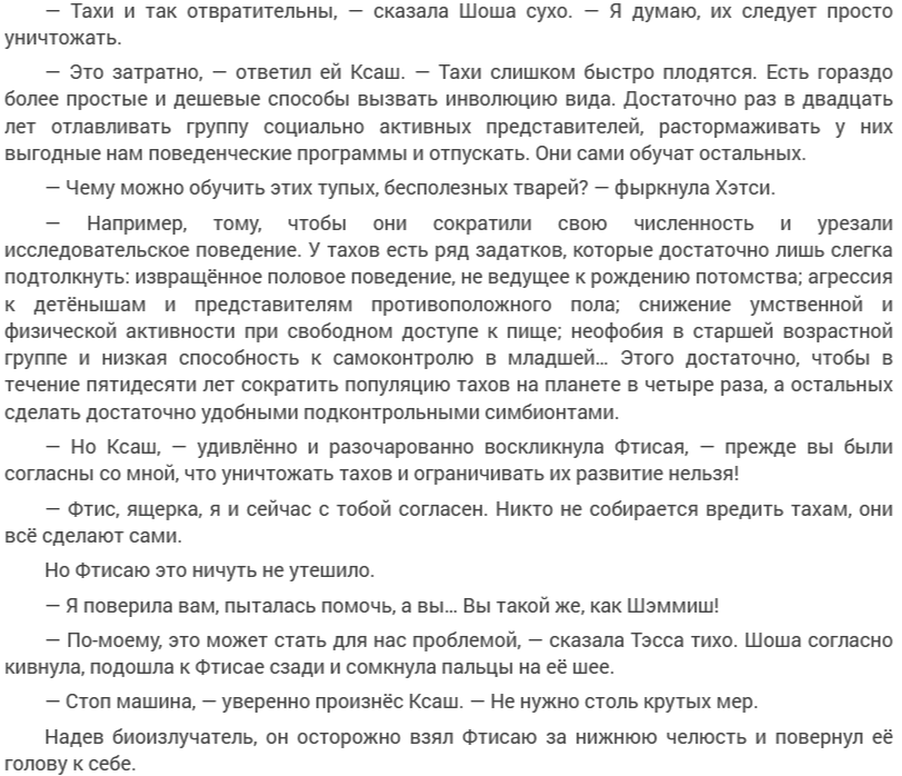 Болотница ещё что-то вещает о разнообразии, якобы, это самоцель, но тут снова не понимаю. Шен Су инвазивный вид на Тахале, такие счастья никому не приносят. А сам Тахал не резиновый, чтобы за этим разнообразием гнаться. Не проще ли чтобы разнообразие было за счёт того что каждый вид живёт на своей родной планете? Если бы как-то автор расшифровал, почему Болотница видит решение проблемы в том, чтобы на Тахале Шен Су оставить, а то там как раз идут отсыла на Творца, мол, раз Шен Су с неба упали то...
