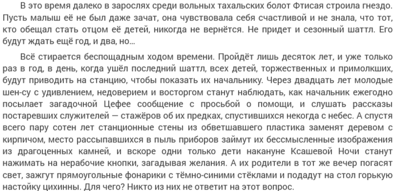 Глава, в которой находится этот отрывок, называется "Ксашев день", а тут упомянута какая-то Ксашева Ночь. Не понятно, каким макаром этот вредный Ксаш попал в историю великого народа Шен Су (Тазальской его части), которую помнят через много поколений. Ксаш всего лишь прилетел на Тахал-1 с некой проверкой, его там пытались обхаживать и отваживать, он в конце вроде как улетел на корабле, и по прогнозом одного местного старожила - Хиссура, должен был загнуться из-за того, что плохо лечил полученные травмы, а потом поехал на транспорте. Казалось бы - выдохнули и забыли. Как и почему его имя вдруг вошло в историю народа?