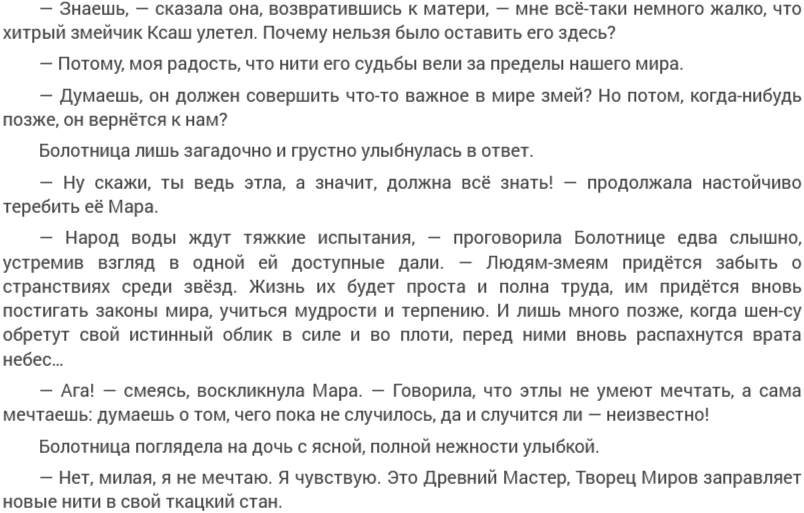 Так вот это и остаётся в итоге непонятным. Потому что в конечном итоге некая этла Болотница, ссылаясь на всякие абстрактные понятия, вроде замысла Творца, полотна мира и дыр в нём, а так же красоты и мечтаний, совершает какие-то действия, судя по всему - волшебство, но даже что происходит в результате этого волшебства - остаётся только домысливать самому.