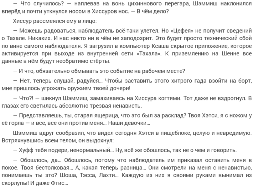 Но Шеммиш заводится сразу, замахивается когтями. А то (пьяный) смотрит на него с трезвой ненавистью. Как сказано у автора. Причины этой трезвой ненависти, надо сказать, мне не ясны. Хотя в предыдущем тексте есть упоминание, что эти двое не очень-то ладят, и вообще-то не друзья, просто терпят друг друга и вынуждены взаимодействовать по причине совместного сосуществования, но если взаимная неприязнь постоянна, зачем вот здесь, в этом кусочке текста про ненависть писать? Когда автор так упоминает ненависть, то подразумевается некая конкретная причина. И не просто так, а потому что в данный момент это важно для понимания некой ситуации и дальнейшего развития событий. И вот я не нахожу за что Хиссуру именно сейчас смотреть на Шемиша с ненавистью, и чем это так важно для сюжета. Потому что Шеммиш замахнулся на Хиссура лапой? Но это нормальная реакция любого порядочного отца, которому сообщили что причинили какой-то вред его дочке, за что ненавидеть сразу, если сам провинился? Не важно, угрожали ей самой или брали её оружие без спросу. Или Хиссур - тот тип персонажей, который начинает ненавидеть каждого, кому сам причинил вред? Не понятно :-(.