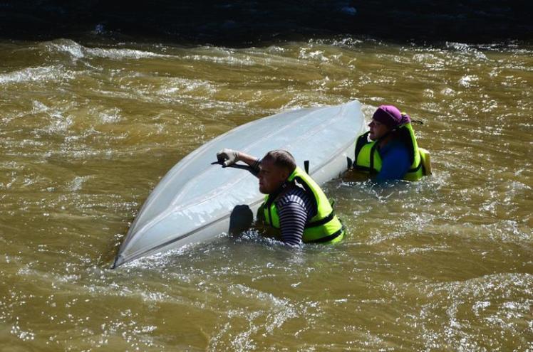 Наконец, пришло время испытать это чудо на воде, тем более, что у нас предстояла плановая отработка оверкиля. Ну, порядок действий в ситуации, когда кувырнуло тебя на пороге и ты плывешь головой вниз, дном вверх. Эскимосский переворот на тяжелой байде малореален, но в экипаже два человека — выныривают, один весла держит, второй цепляется за байду и возвращает ее в правильное положение.