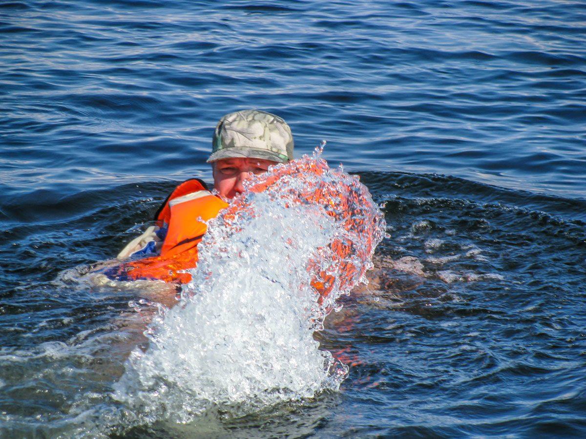 Адмирал принялся плескаться вокруг байдарки, пока его напарник ее переворачивал. Уцепился, потянул, поднял на 45 градусов, но не удержал и она плюхнулась обратно, дном вверх. И так еще два раза, прежде чем адмирал свои водные процедуры прекратил и не помог. За время этих эволюций байда набрала воды по бортик и ее пришлось тащить к берегу в полуподводном состоянии, разгружать, выливать воду и сушить.