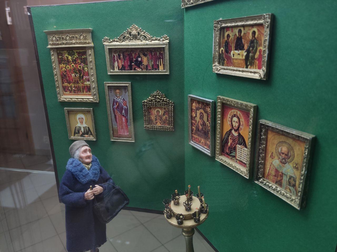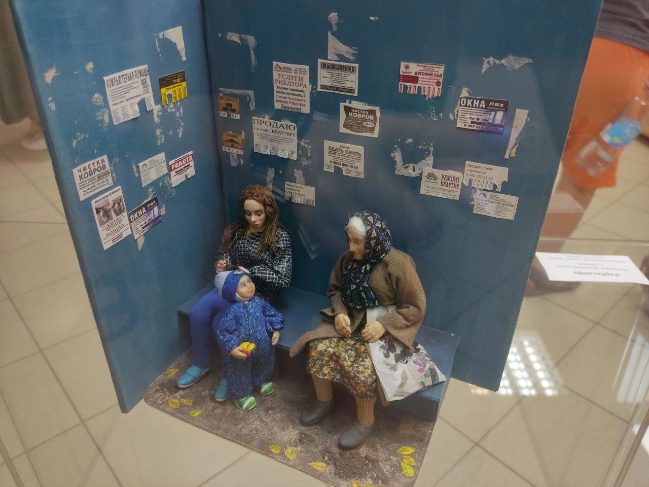 Ещё мы были в одной галерее, где проходила выставка художницы, которая создаёт куклы и мини миры. У неё множество кукол посвящённых одеждам разных эпох, звёздам, сказкам и ещё есть работы, отображающие жизнь.. наших любимых стариков.