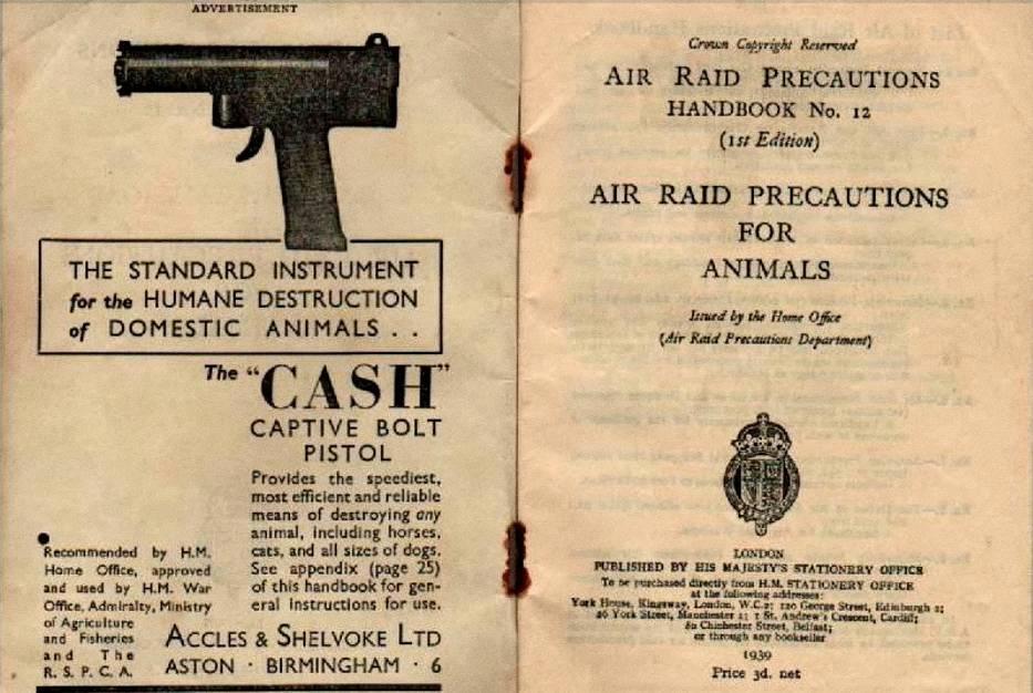 Сформированный в 1939 году «Национальный комитет по мерам защиты животных от воздушных налётов» , опубликовал брошюру под названием «Советы владельцам животных», где предлагалось отвозить домашних питомцев из городов в сельскую местность или просто умертвить по месту жительства, а то типа пориджа из-за них всем не хватит. Также, в брошюре содержались советы по уничтожению домашних питомцев; в частности, в качестве гуманного средства убийства предлагалось использовать пистолет.