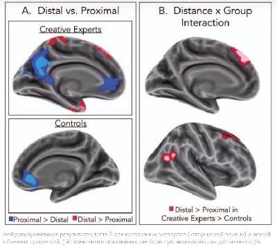 Для моделирования дистальных событий звезды креатива задействовали другую подсистему мозга — дорсомедиальную подсистему сети пассивного режима — dorsal medial system default network. Она, как известно из предыдущих исследований, ассоциируется с воображением намерений и личностных качеств других людей, а также с целым спектром разнообразных процессов: понимание повествований; физическое, временное и социальное представление расстояния; понимание концепций; создание высокоуровневых конструкций или абстракций.