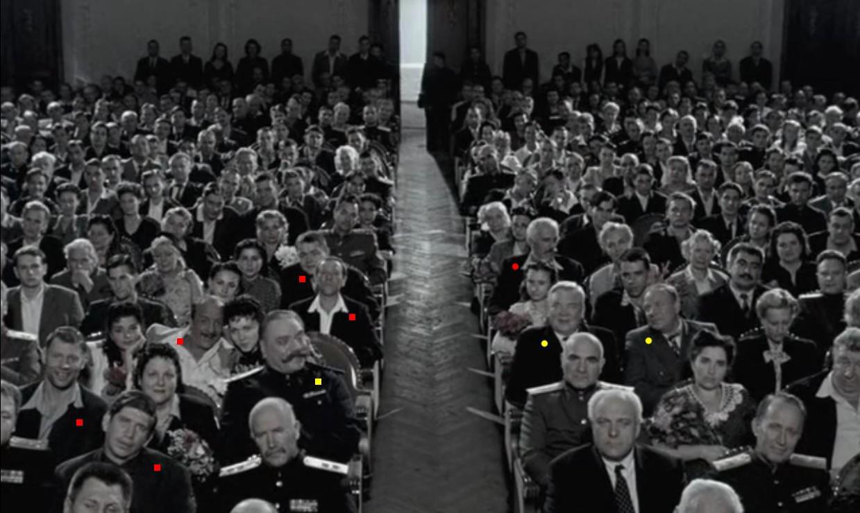 Смотрим картинку. Какие-то малозначащие генералы действительно распределились и тудой, и сюдой, а вот уже знакомые нам воры, обозначенные красными квадратиками, сидят по левую от нас сторону. А чтоб этот народ не баловАлся, за ними специально приглядывает начальник Гоцмана Омельянчук с жёлтым квадратом на мундире.