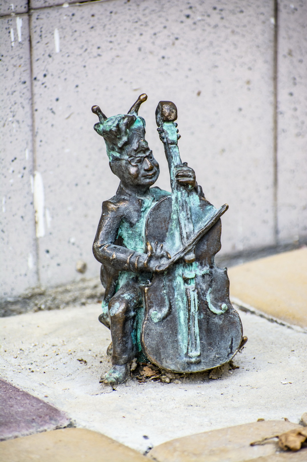 На улице Пушкина выс встретит пчела-музыкант. Контрабас, а может быть и не контрабас, очень сложный инструмент. Мызыкант сосредоточен и вдохновенно выводит сложную мелодию.