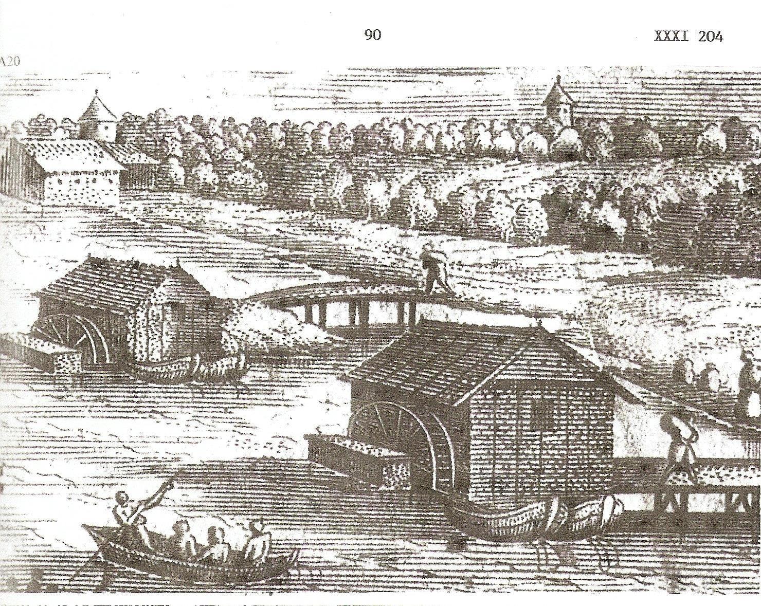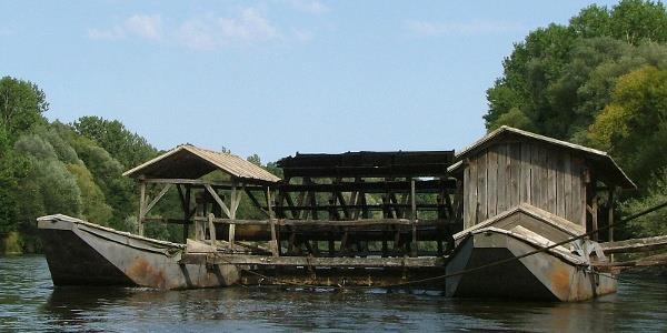 По сути — два понтона, основной со зданием мельницы и вспомогательный, между которыми и располагалось колесо. Существовали и «двухколесные» мельницы с одним понтоном, практически готовые речные пароходы))