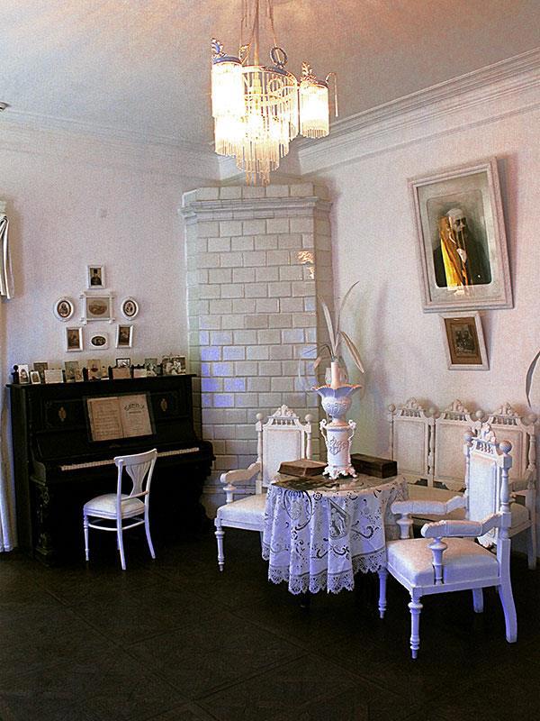 Раскрытая партитура – разумеется, «Фауст» – помещается на пюпитре стоящего у стены фортепьяно. Под его аккомпанемент Шервинский, окрыленный отъездом Елениного мужа, пел эпиталаму богу Гименею. Судя по цвету, фортепьяно – аутентичное, а, значит, играла на нем и мать Булгакова, Варвара Михайловна. Вот, кстати, ее фотография – как раз в этой гостиной под портретом уже год как покойного мужа.