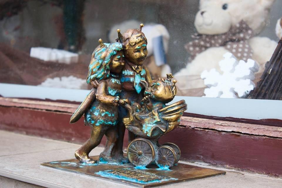 А на соседней улице, но окне магазина "Детский мир", мы встречаем эту пару уже с коляской. Счастливые родители везут крохотную пчёлку в "Детский мир", покупать первую игрушку.