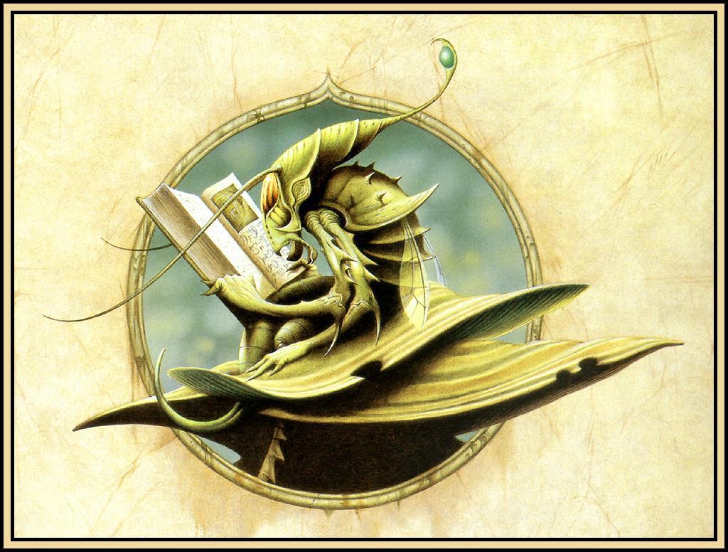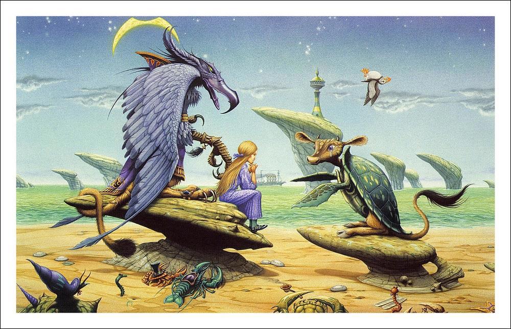 Если вдруг случается творческий затык, не думается, не пишется, "ключ фантазии иссяк - не бьёт его струя", как писал когда-то Кэрролл - есть недурное свойство быстро вернуть себя в форму. Не книги - чужие тексты, тем сильнее, чем они лучше, переключают на чужую волну, действуют слишком резко - а иллюстрации. Иллюстрации, нарисованные фантастические миры, созданные коллегой-художником, раскочегаривают воображение без побочных эффектов. Художник, умеющий точно и ярко изобразить галлюцинацию, грёзу или сон - на вес золота. Мне кажется, это даже более редкий дар, чем дар писателя-фантаста божьей милостью.
