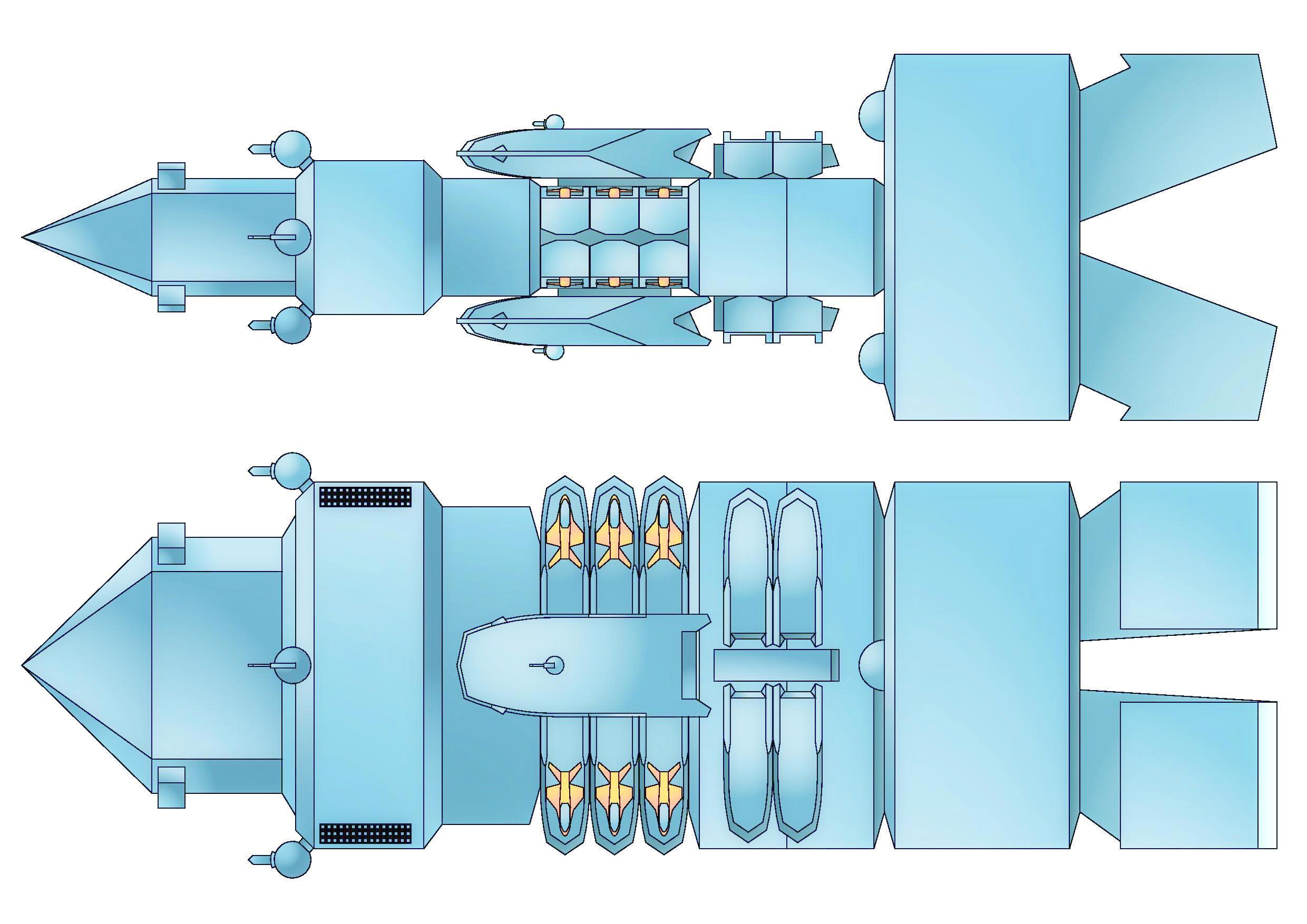 Начало процесса и его обоснование можно посмотреть в моей маленькой заметочке https://author.today/post/40645 . Процесс имеется в виду написательства, писанины... короче того самого, чем большинство местных активно и даже иногда весьма успешно занимается (я не из этого муравейника). Для тех, кому лень кнопку нажимать, поясню - я там про "проектирование" корабля для собственного написания говорил. Так как я из тех ещё времён, то имею привычку доводить дело до какого никакого логического завершения, даже если мне это нафиг не нужно. Да... привычку имею, но очень капризную. Поэтому она меня иногда покидает, а может побеждает другая привычка  - ЛЕНЬ. Так и здесь случилось. Хотел, понимаешь, нарисовать для тех, кто здесь читает то, что я понаписал, объёмную картинку этого корабля из моей книжки, но тут одолела она самая - ЛЕНЬ. Поэтому я, зевнув, просто раскрасил плоскую (Автокадовскую) картинку. Вот что получилось при трансформации в жепегешный формат:
