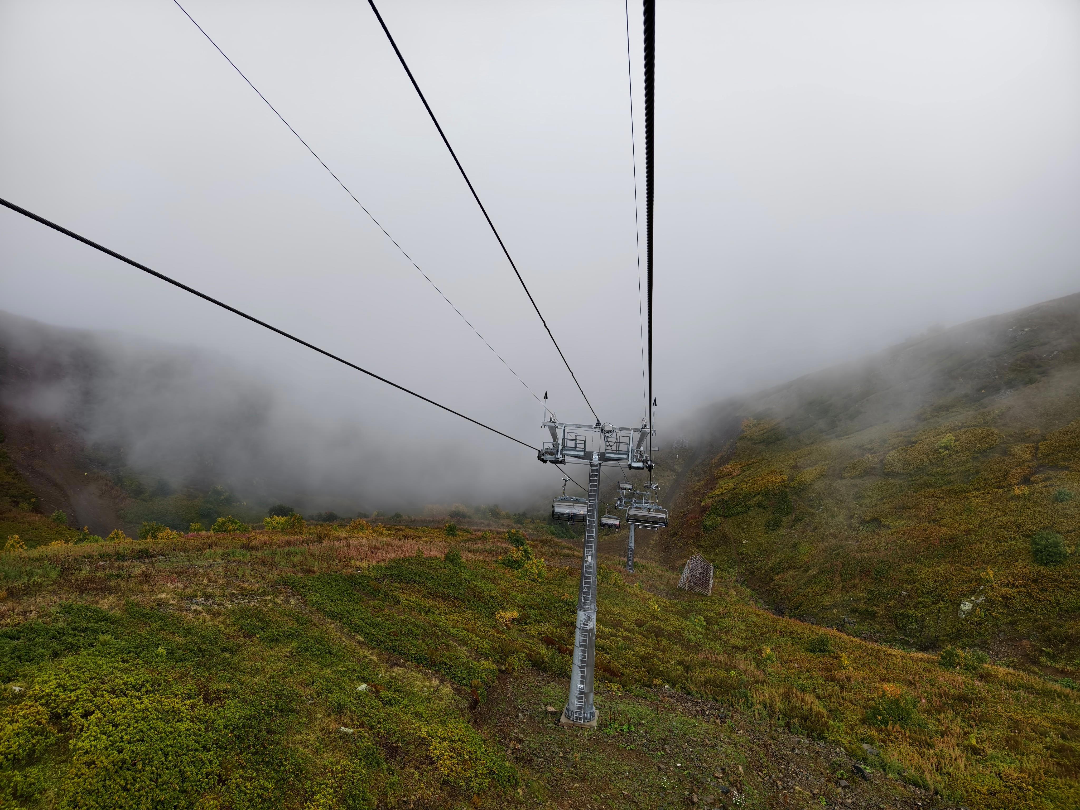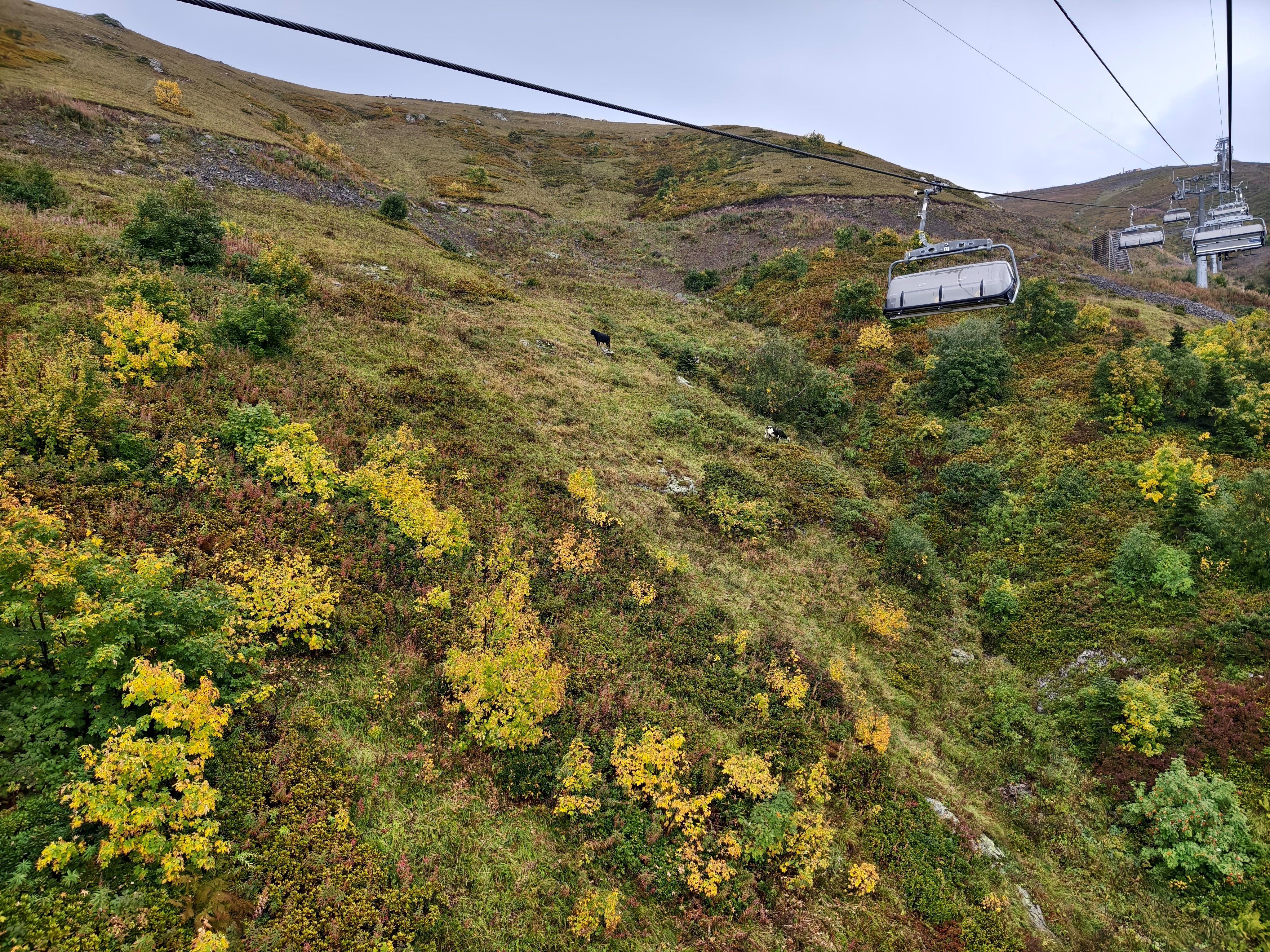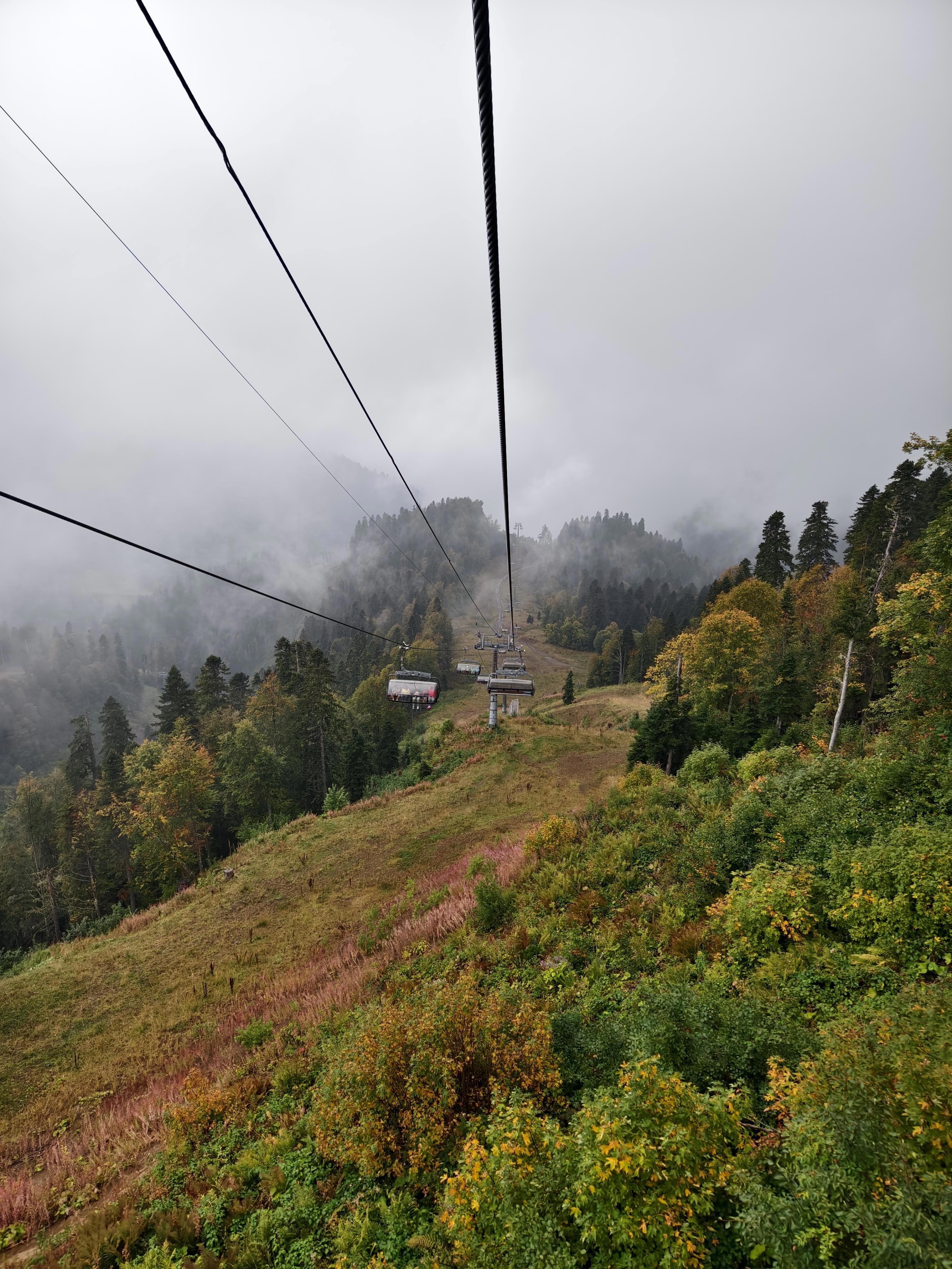 Поднимаемся ещё выше и пересаживаемся на другой подъёмник Волчья Скала. Он идёт вниз, кресельного открытого типа и не высаживает людей внизу. Как карусель для взрослых.