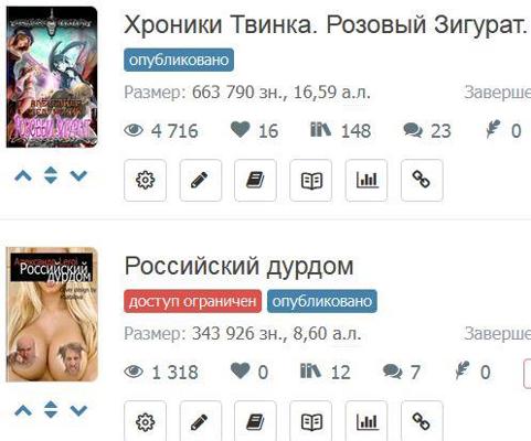 По подлому кое-кто удалил мой "Российский Дурдом", который представлял из себя сборник моих рассказов. У меня несколько сотен рассказов. Если бы не это удаление, я бы стал постепенно их на АТ выставлять десятками. Но из-за этого удаления ограничился всего лишь парочкой. Это моя ответочка. биомусор мне наставил 12 826 минусов в репутацию - я в ответочку в наказание решил не выставлять "Чёрный Зигурат", пока Репутация не станет положительной! Хочет биомусор все пять книг "Хроник Твинка" прочитать - придётся ему плюсики ставить! А люди достойные доверия Х.Т. уже прочитали. А я уже "Хроники Основы" пишу... Так что я сам себя делаю героем своих произведений )