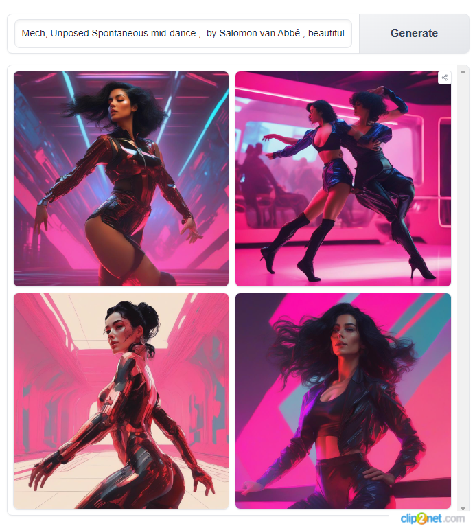 И еще сильное слово: mid-dance. Не забывайте, что можно добавлять в промпт описания одежды, цветовой гаммы, обстановки, освещения, прически, текстур итп (но чем длиннее промпт, тем "разбавленнее" отдельные слова. ) . Для поиска хороших слов можно использовать чат-ГПТ, он неплохо подсказывает. Возможные слова, чтобы изобразить движение: