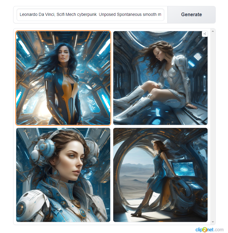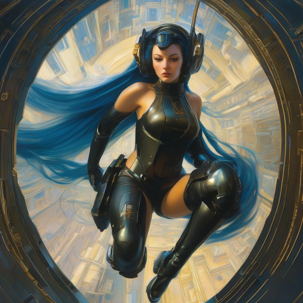 Leonardo Da Vinci, Scifi Mech cyberpunk  Unposed Spontaneous smooth motion , elegant, zero gravity, floating hair, full-body,   beautiful female, spacestation , detailed,   by Salomon van Abbé,  blue, illustrated face